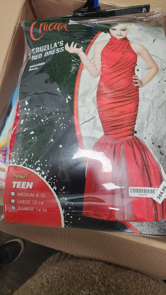 Selling a Cruella's Red Dress costume for teens! It's brand new in the packaging. The size is X-Large (14-16). Includes the gown. Perfect for Halloween or a costume party