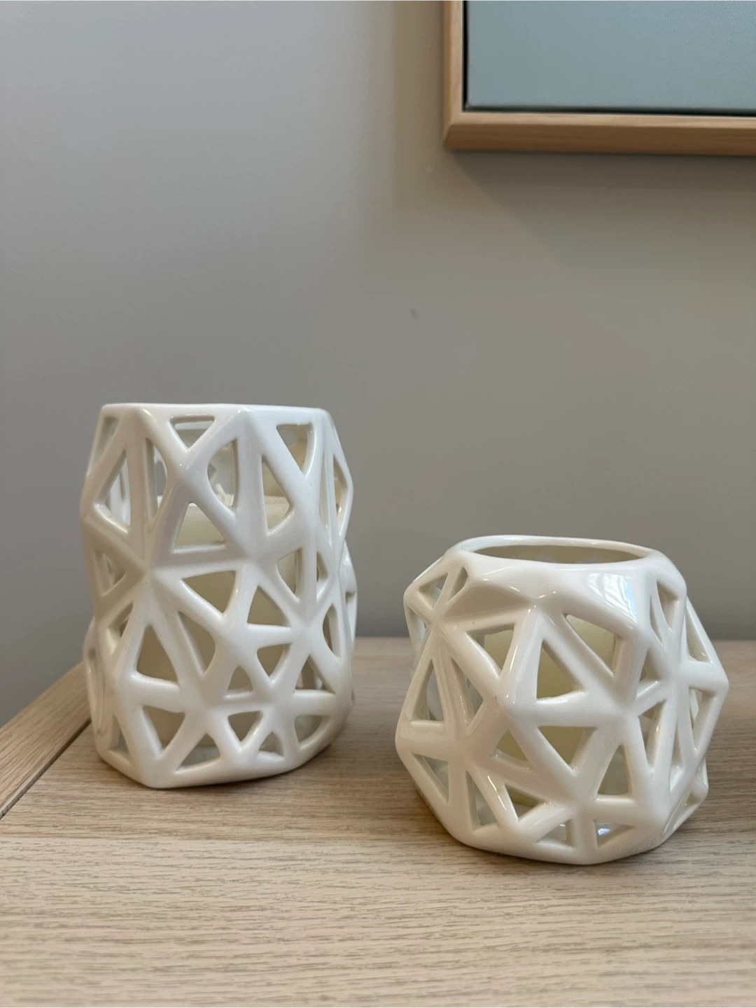 Here's a set of two stylish white candle holders with a cool geometric design. Purchased from Urban Barn.
