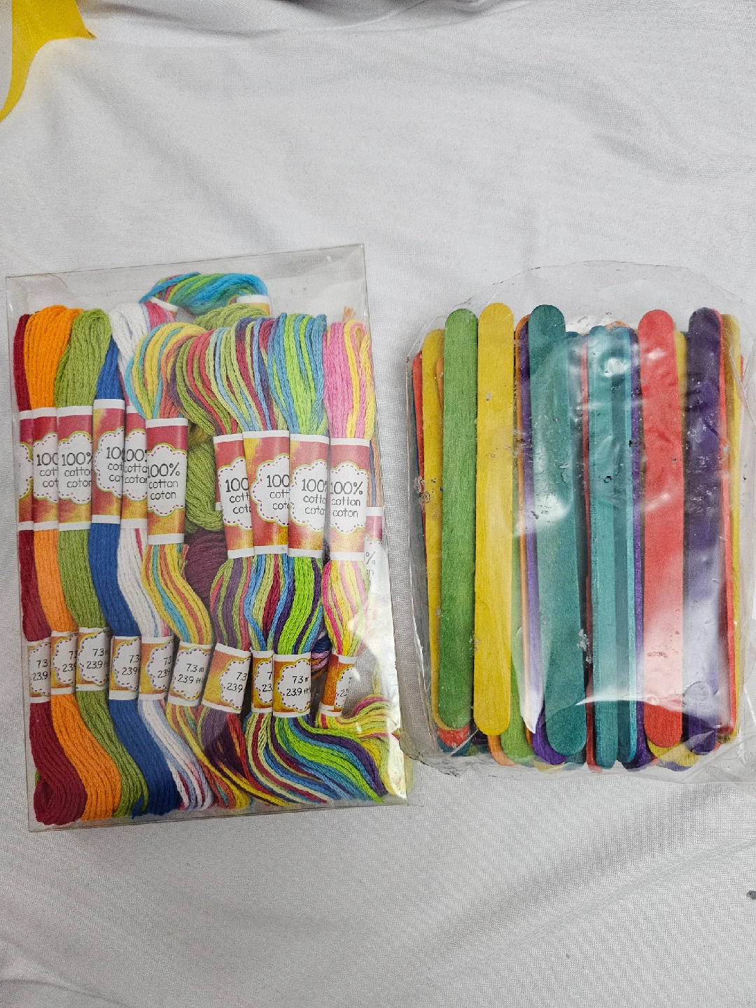 I'm selling a set of colourful embroidery floss and craft sticks. Perfect for your next craft project! The floss is 100% cotton.