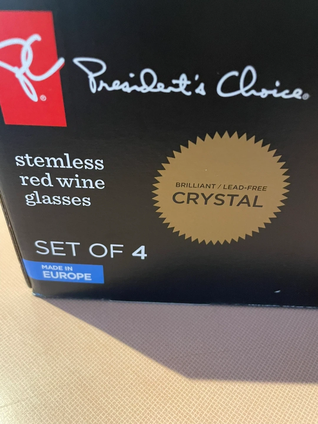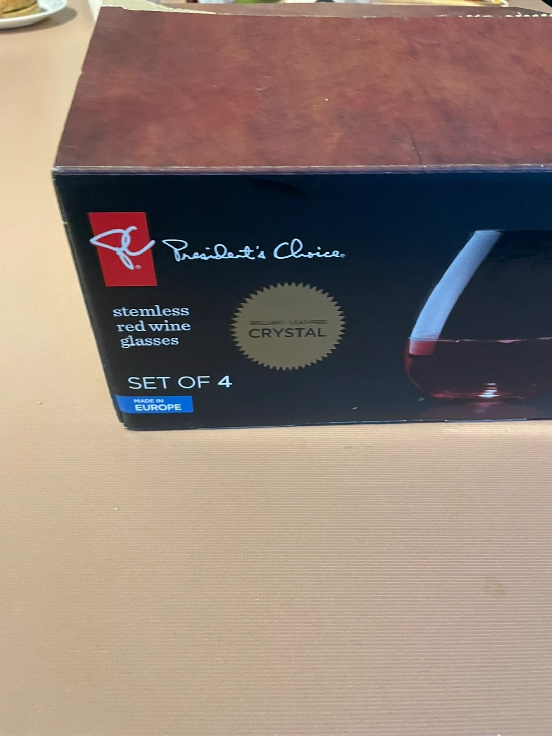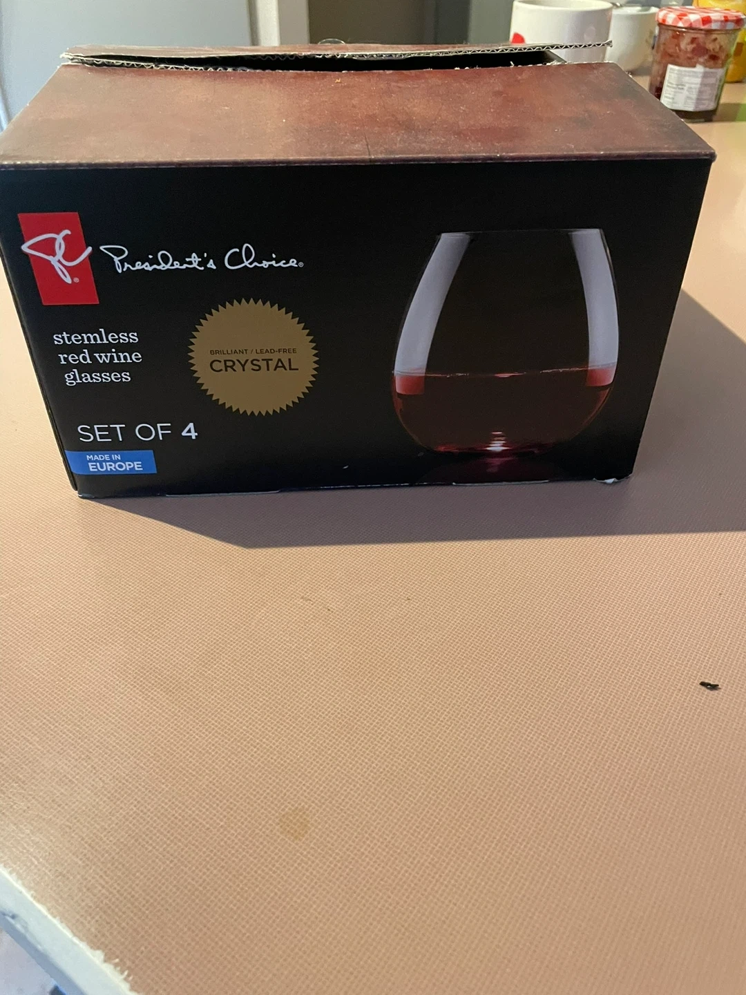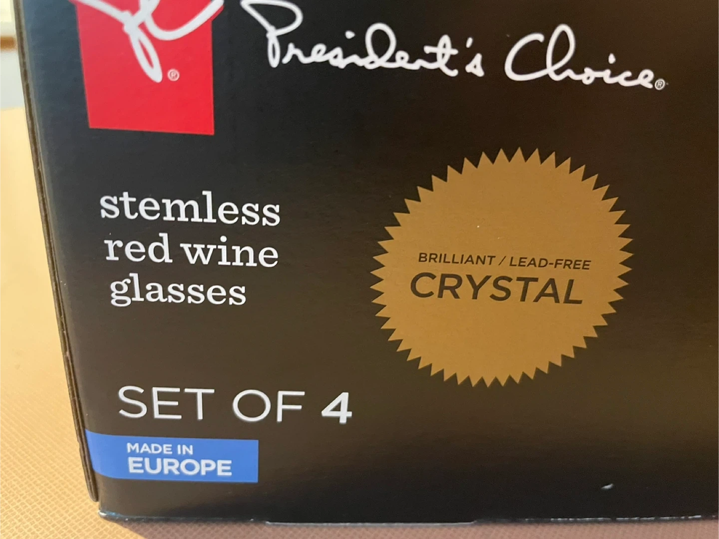 Selling a set of 4 stemless red wine glasses from President's Choice! They're made of brilliant, lead-free crystal and come in their original box