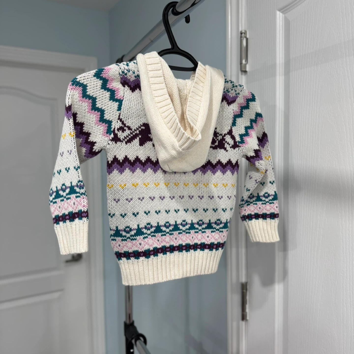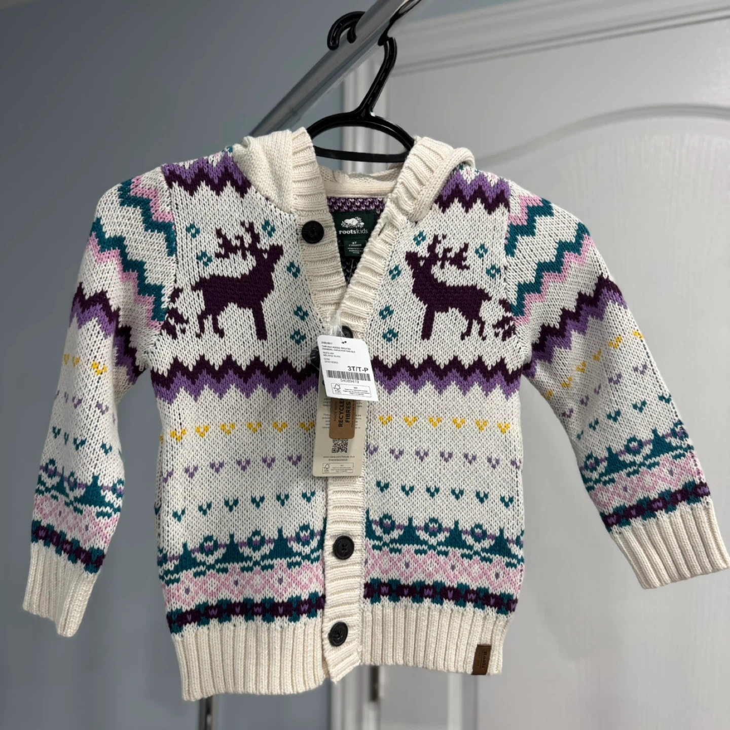 A cute Roots Kids hooded cardigan in size 3T. It's in great condition and features a fun pattern with deer.