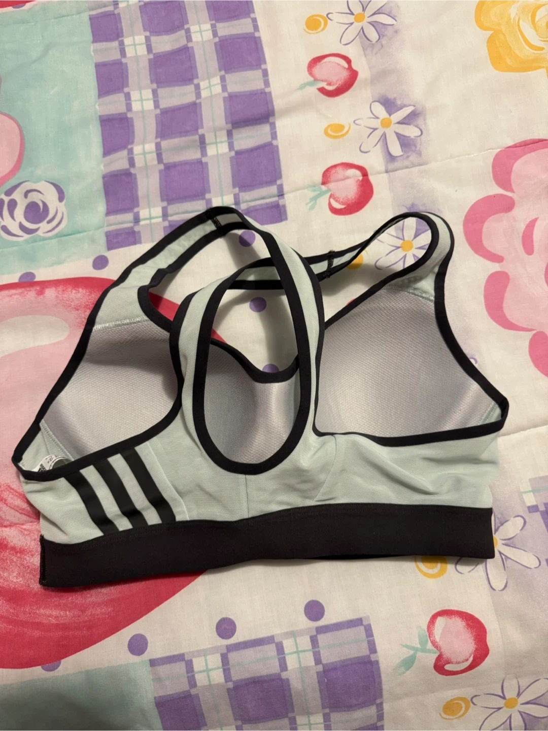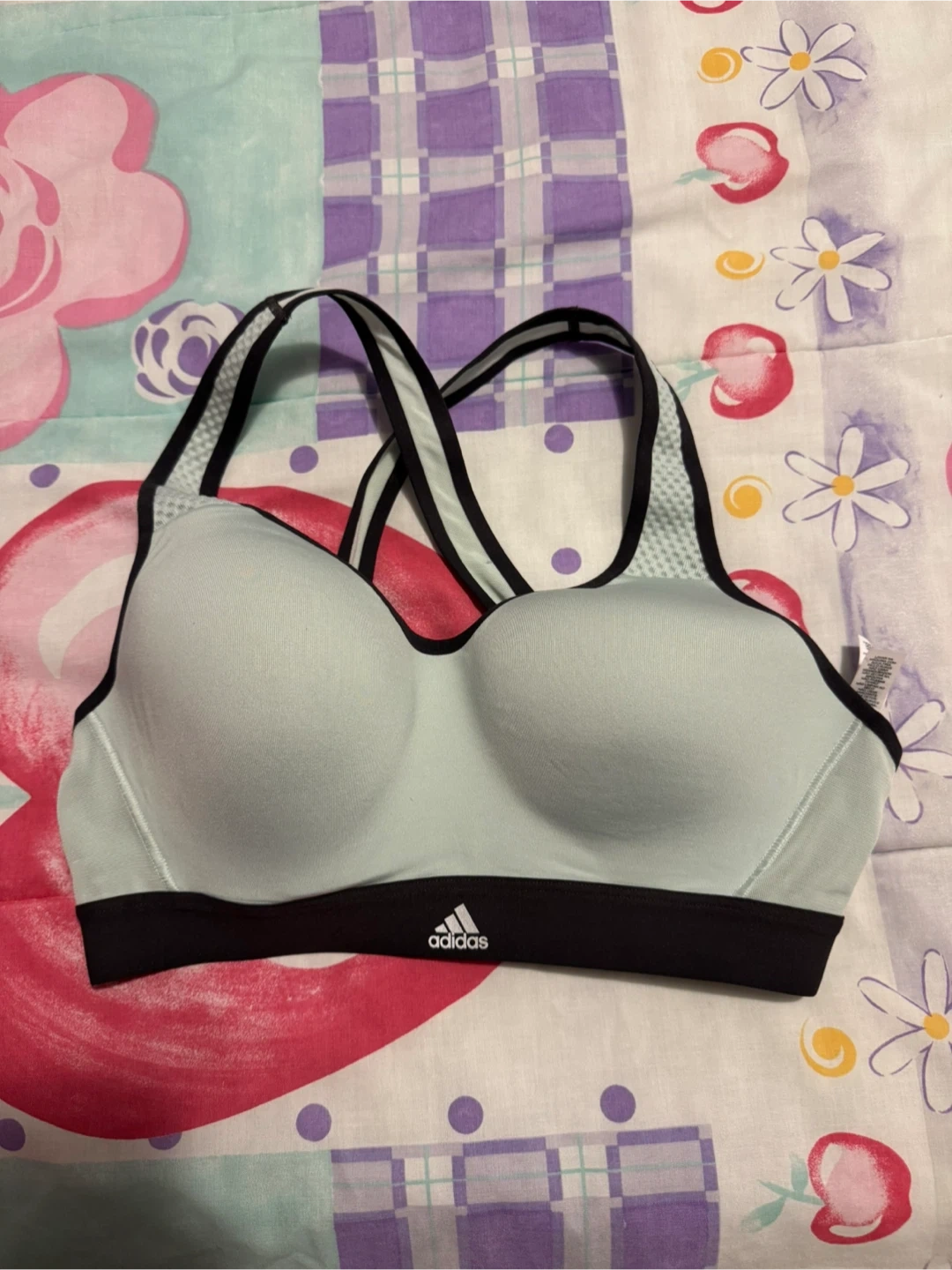 Selling a mint green Adidas sports bra. It's in great condition and features a dark gray band and trim around the straps. Perfect for workouts or everyday wear!