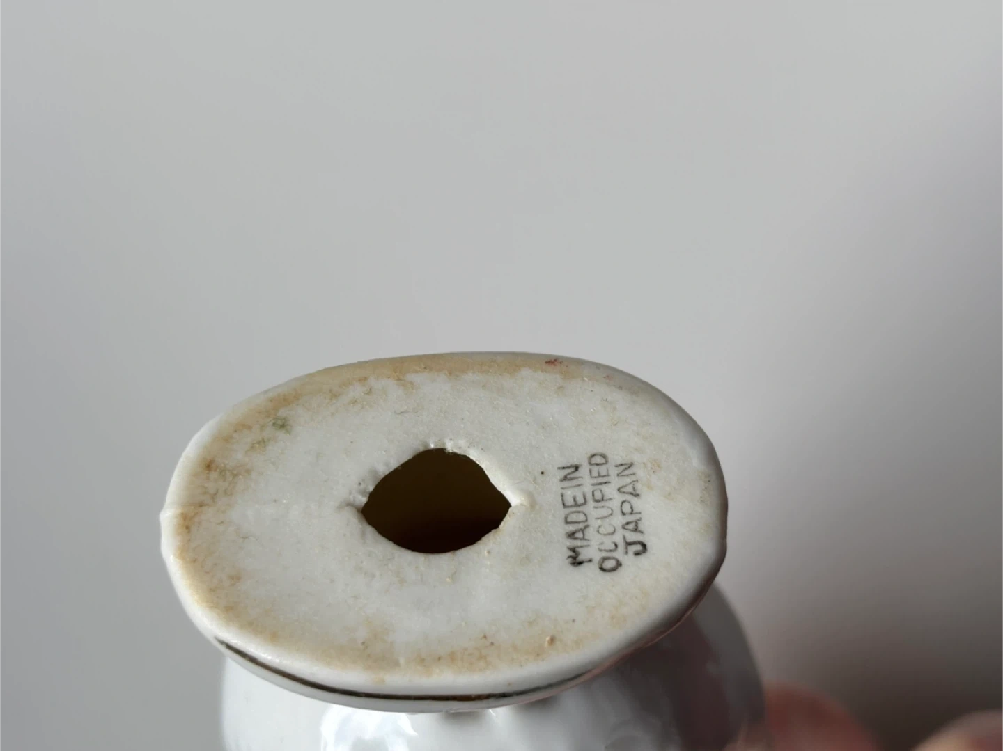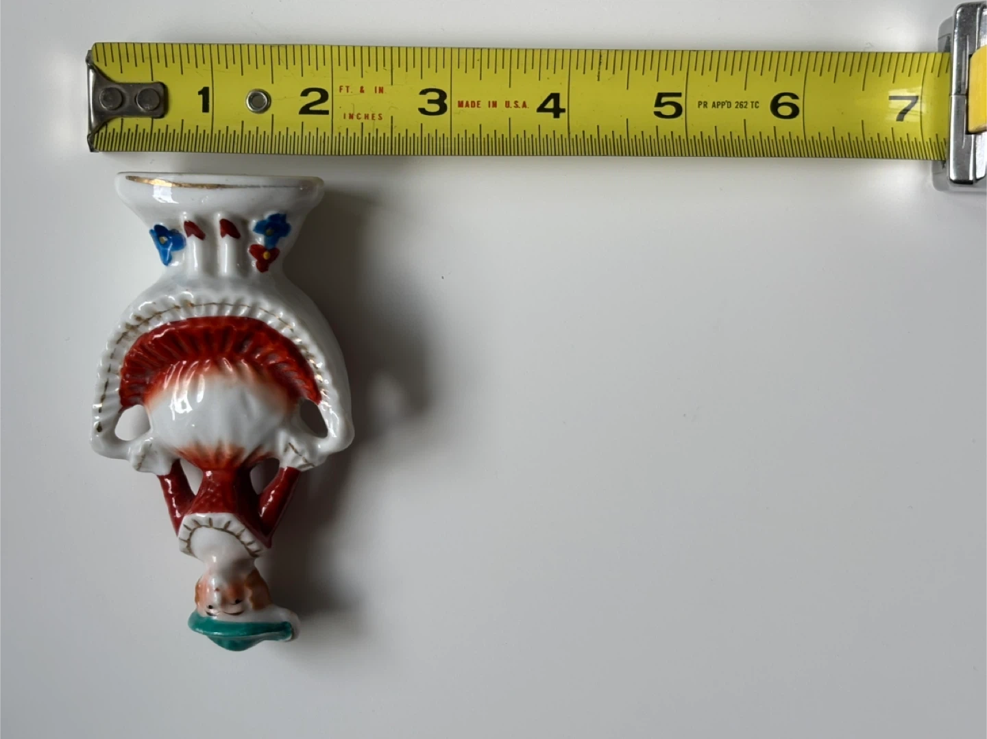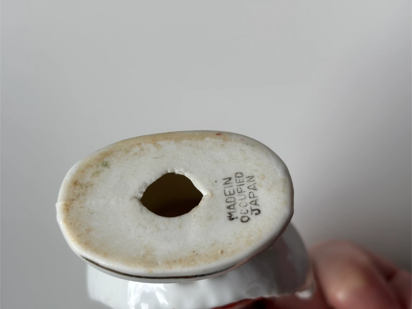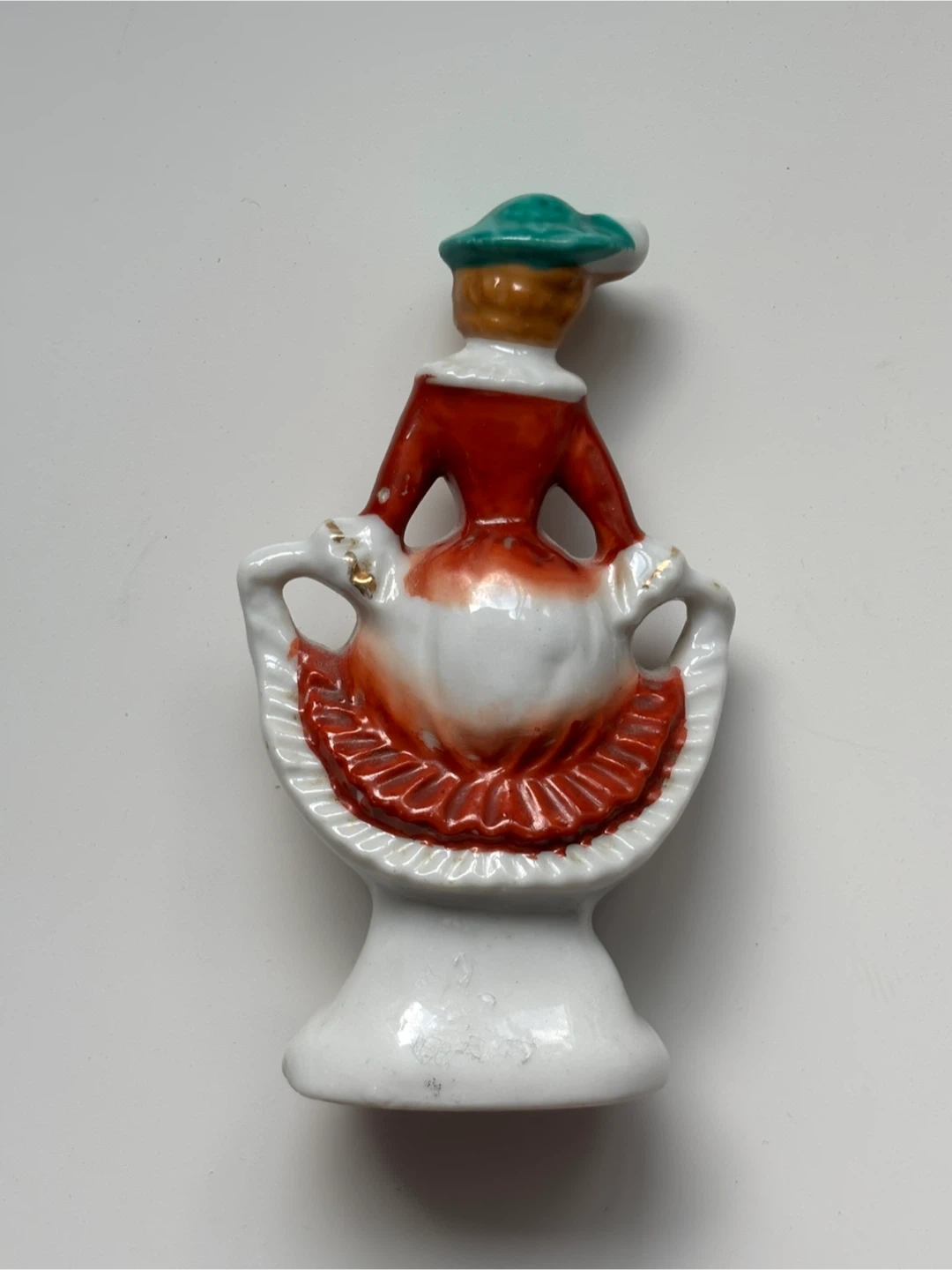 Selling a vintage figurine marked "Made in Occupied Japan" on the bottom. It features a woman in a red and white dress with a green hat. It measures approximately 4 inches tall. A unique piece for collectors!