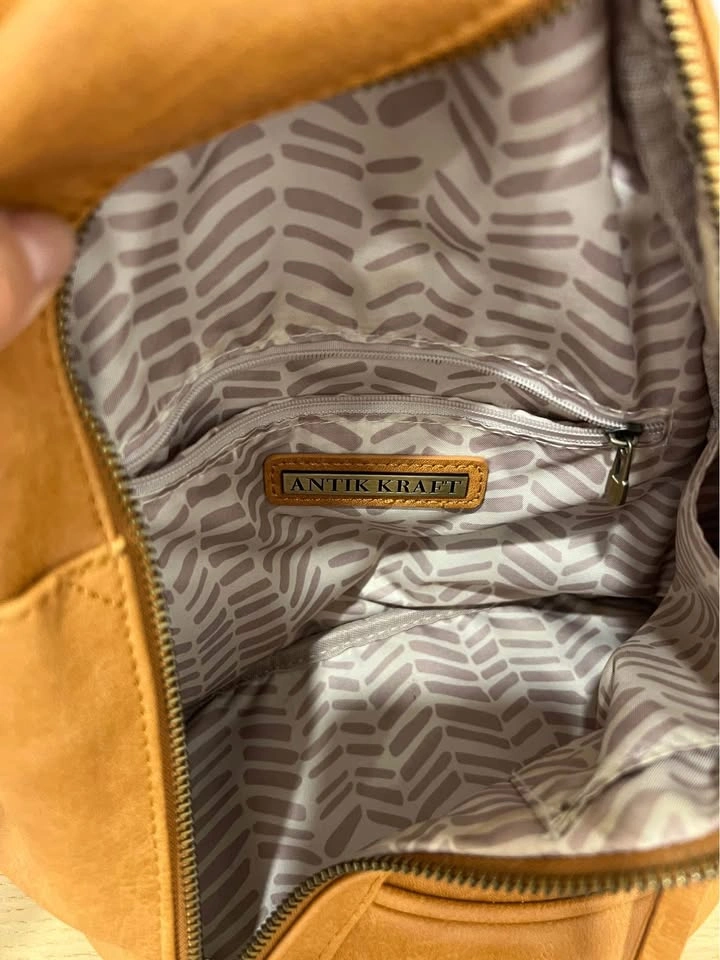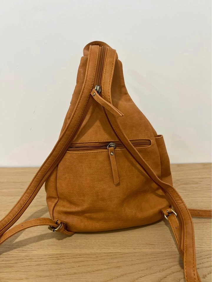 Cool and functional sling bag in a rich caramel/tan faux leather. Perfect for hands-free carrying of your essentials. Features: • Unique Design: Modern, tear-drop shape worn comfortably over one shoulder or crossbody. • Storage: Multiple exterior zippered pockets with bronze-tone hardware for quick access. • Material: Soft, durable faux leather. Condition: Excellent, like-new condition. Pick up: Newmarket, ON.