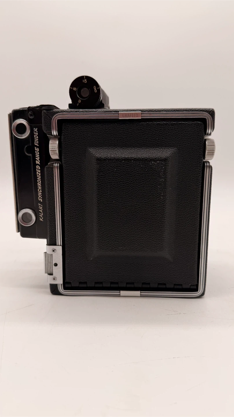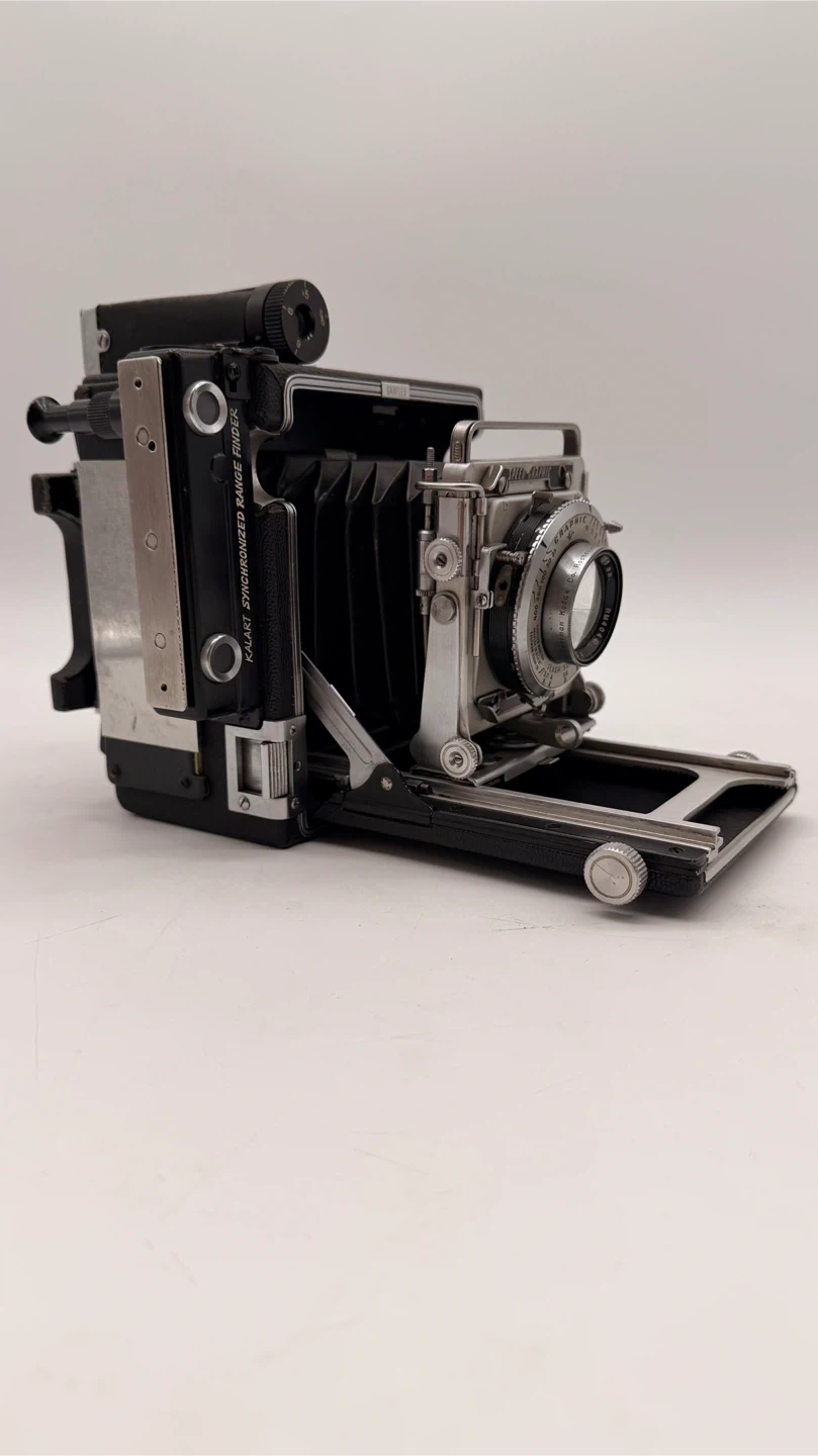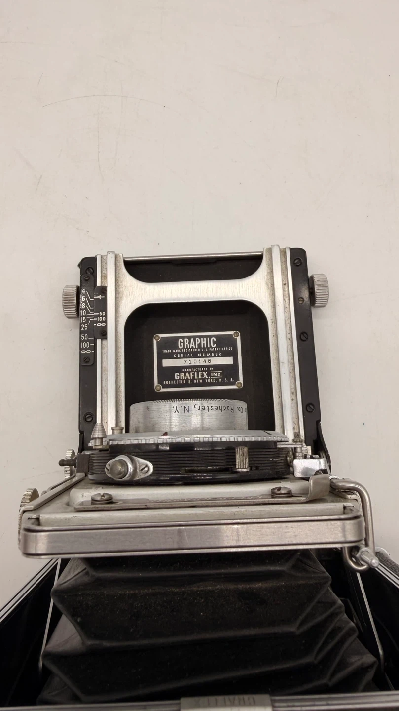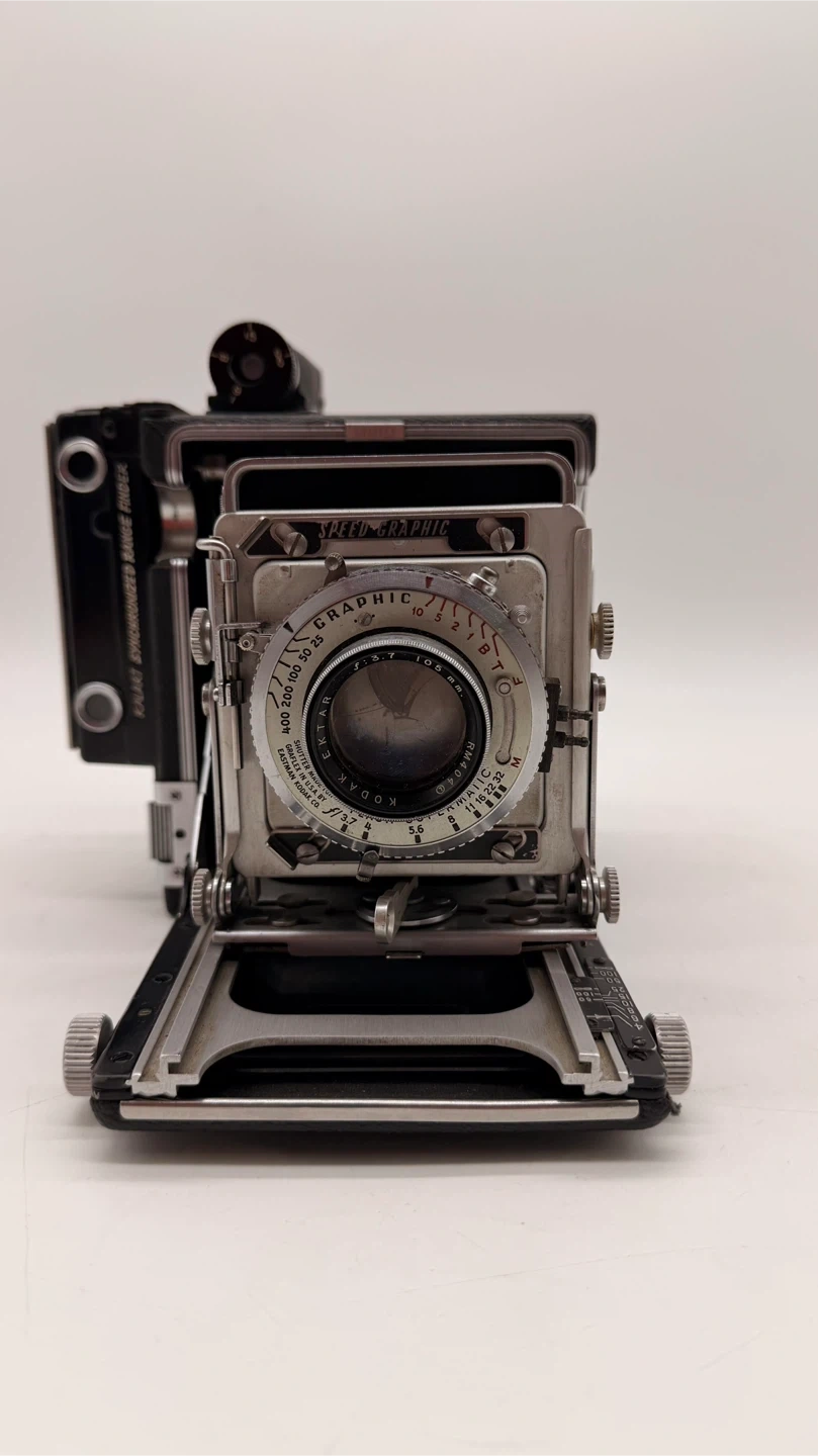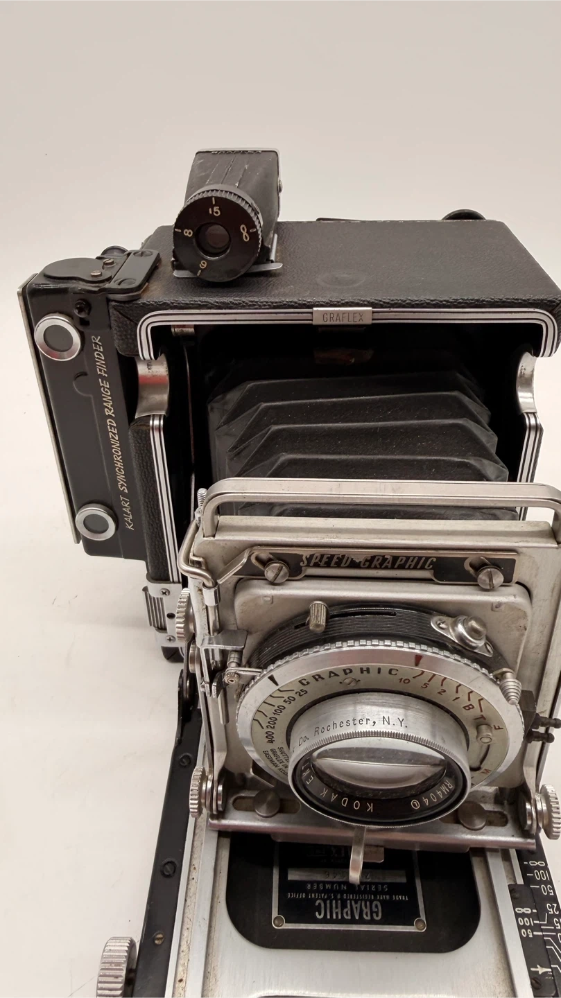 Vintage Graflex Speed Graphic 4x5 Large Format Press Camera with Kodak Ektar 127mm f/4.7 lens. Manufactured in Rochester, New York, USA. ✅ Includes: • Kodak Ektar 127mm f/4.7 lens • Kalart Synchronized Range Finder • Folding bellows design • Serial number: 7101486 ⚠️ Please note: • Missing side leather handle • Missing rear focusing hood/viewing shade (see reference photos) • Not tested with film – sold as-is for parts, restoration, or display Condition: Very good cosmetically for its age, all knobs and movements appear smooth. Pickup North York or shipping available at buyer’s expense.