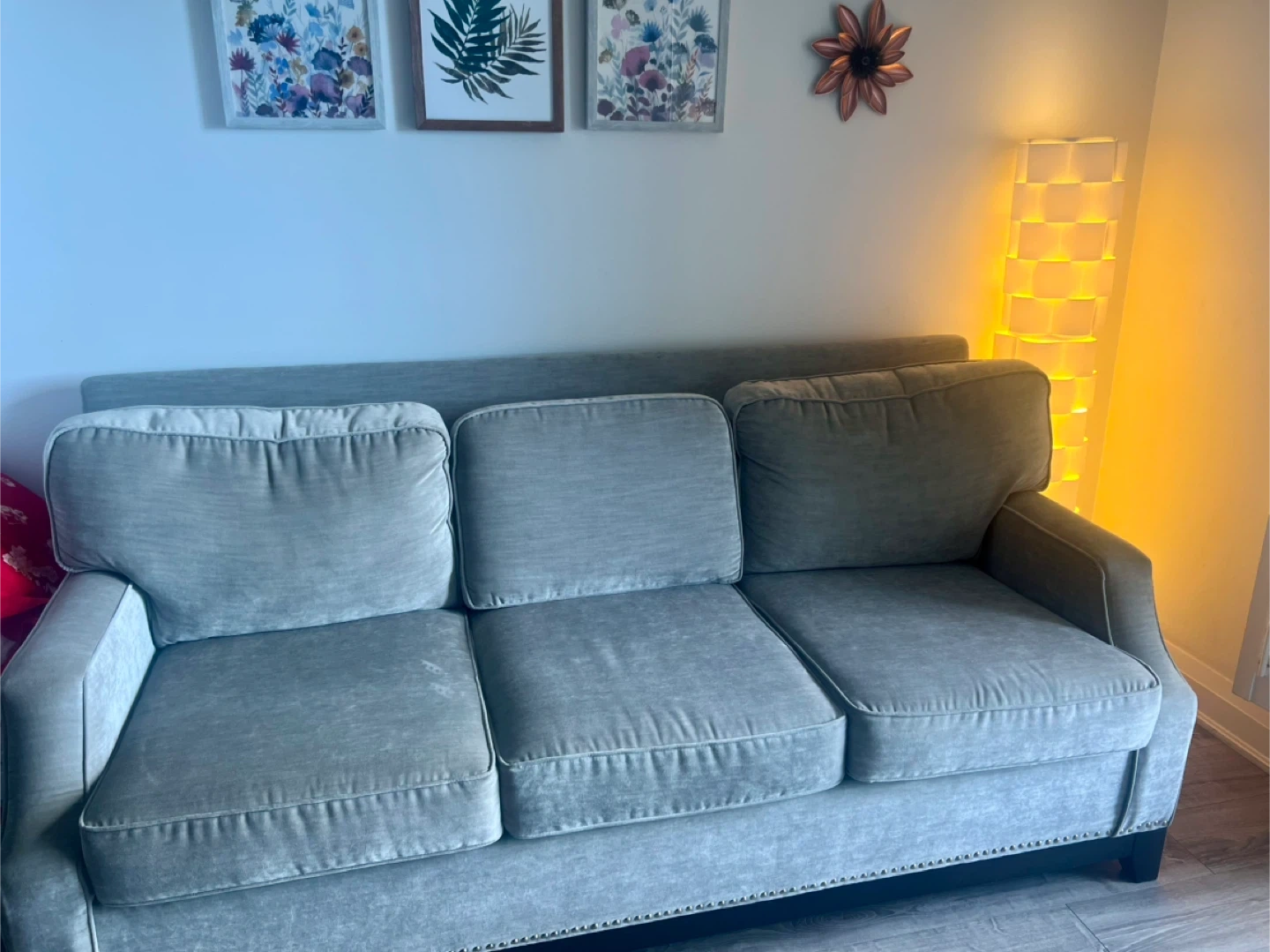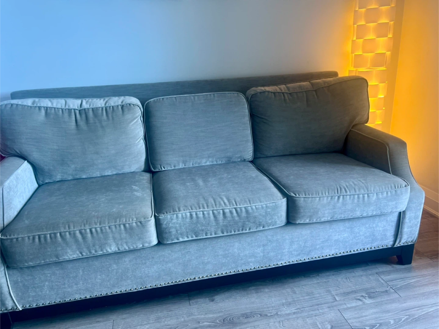Selling a comfy grey sofa that would look great in any living room! It's in good condition and has a classic design. The cushions are soft and supportive, perfect for relaxing after a long day. It's a great piece of furniture to add to your home!