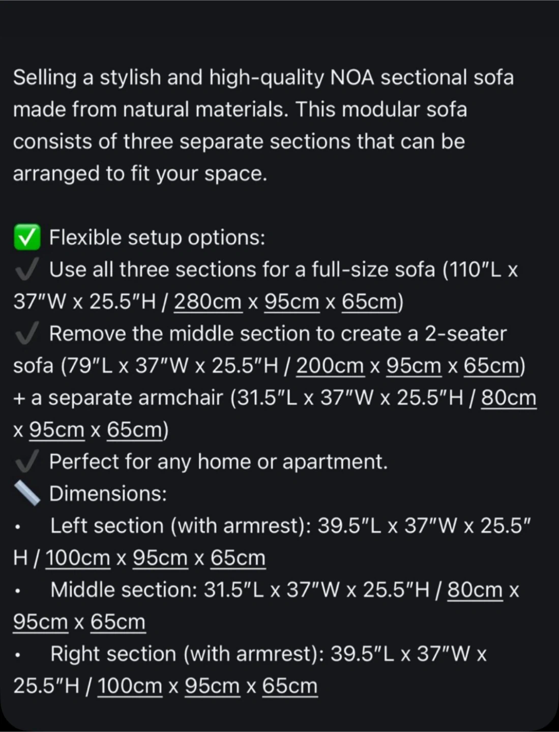 Selling a stylish and high-quality NOA sectional sofa made from natural materials! This modular sofa consists of three separate sections that can be arranged to fit your space. - Use all three sections for a full-size sofa (110"L x 37"W x 25.5"H / 280cm x 95cm x 65cm) - Remove the middle section to create a 2-seater sofa (79"L x 37"W x 25.5"H / 200cm x 95cm x 65cm) + a separate armchair (31.5"L x 37"W x 25.5"H / 80cm x 95cm x 65cm) - Perfect for any home or apartment - Left section (with armrest): 39.5"L x 37"W x 25.5" H / 100cm x 95cm x 65cm - Middle section: 31.5"L x 37"W x 25.5"H / 80cm x 95cm x 65cm - Right section (with armrest): 39.5"L x 37"W x 25.5" H / 100cm x 95cm x 65cm ** AVAILABLE : Monday October 27th. ** No low balling, price is firm.