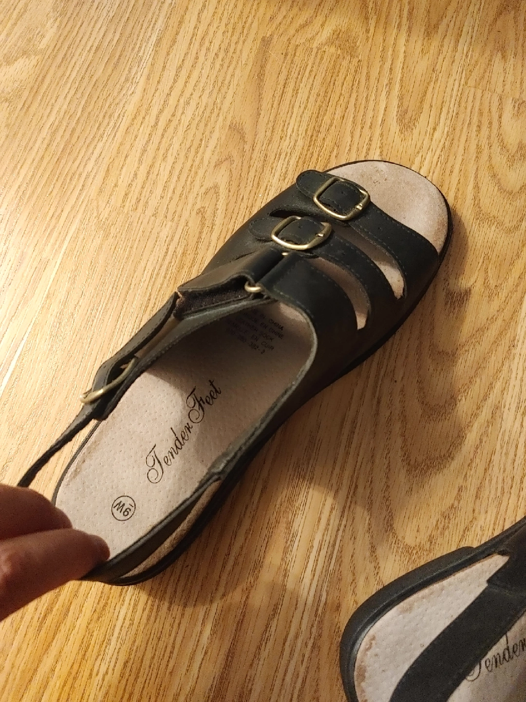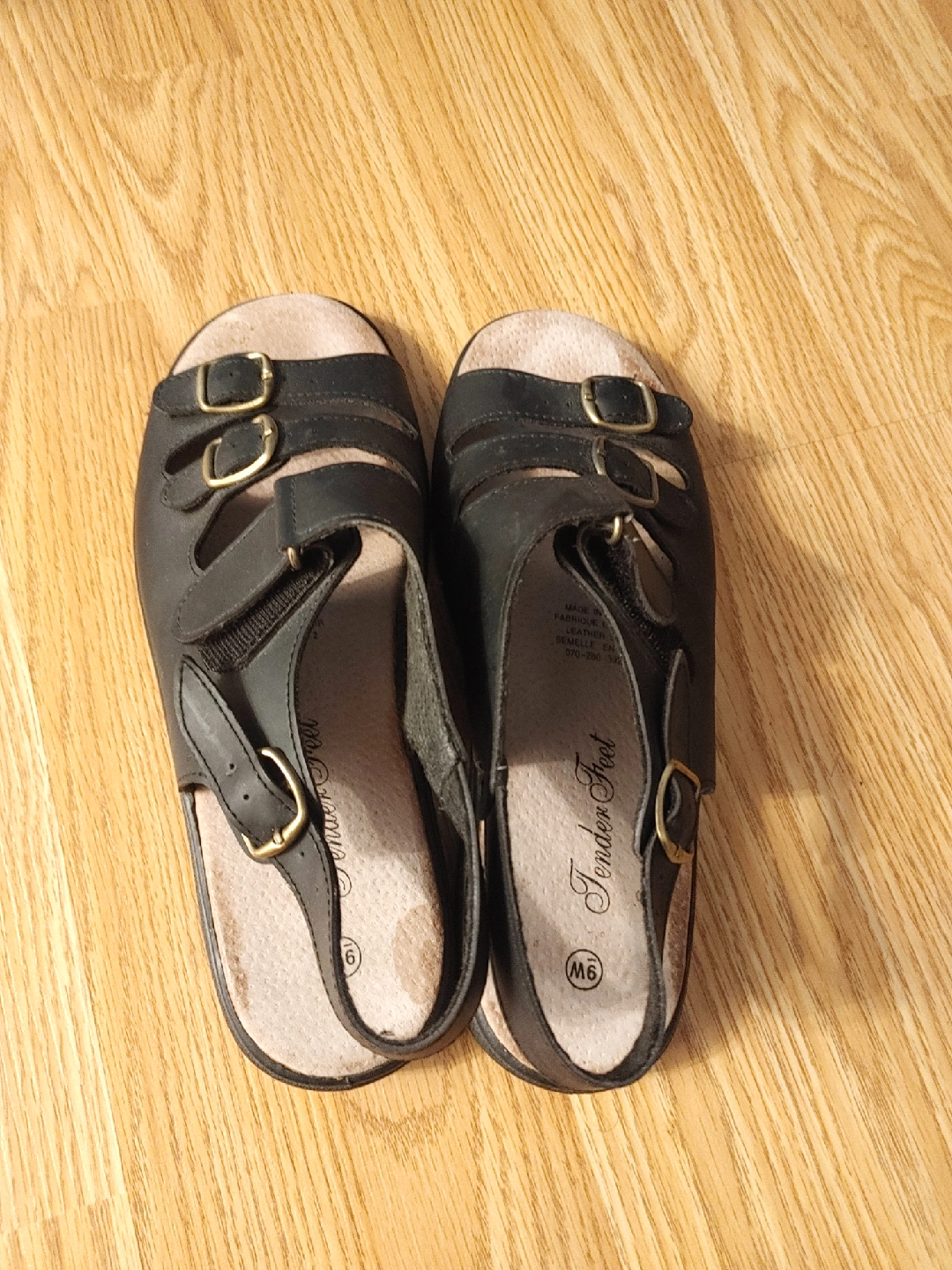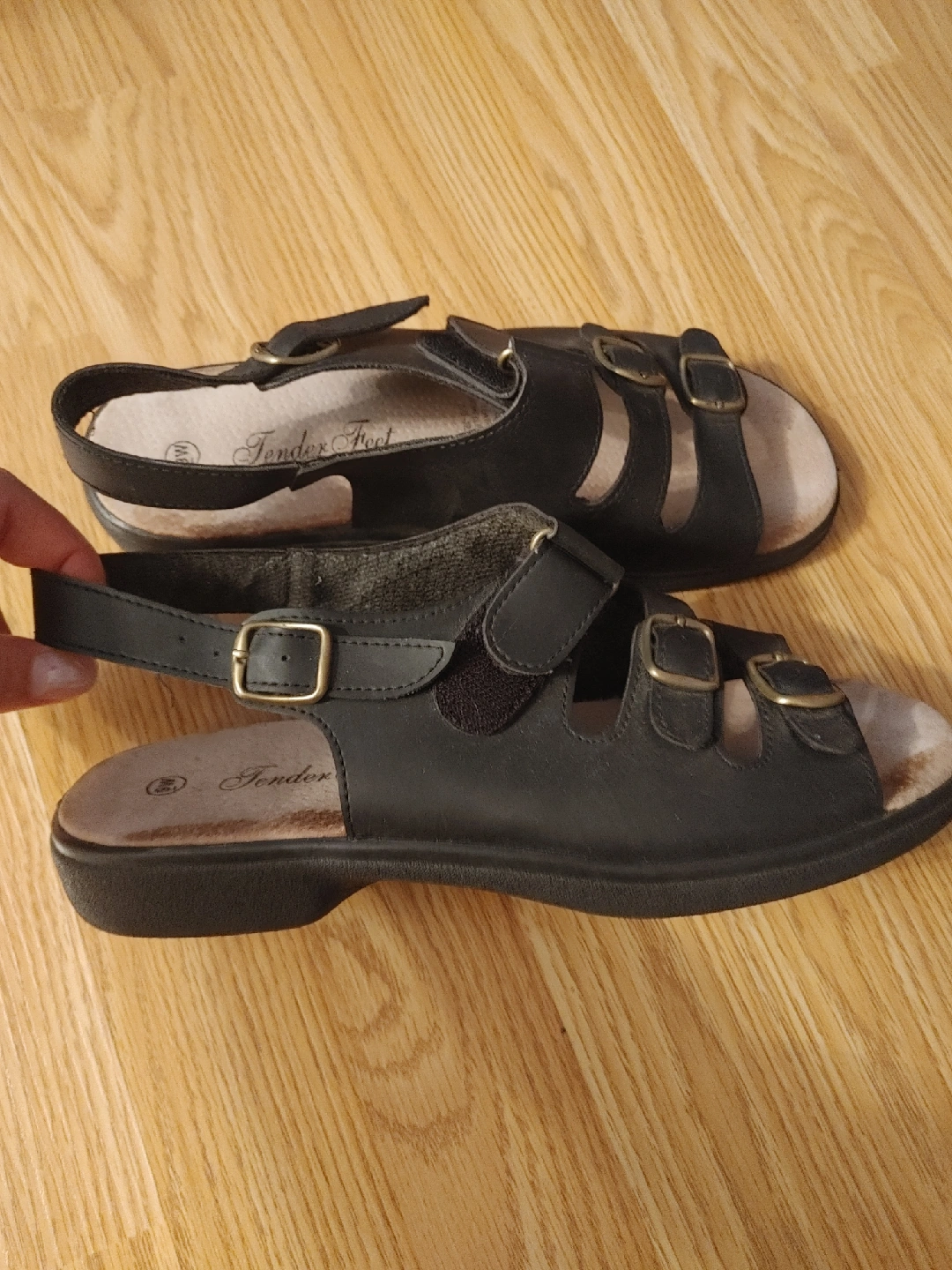 Selling a pair of Tender Foot sandals in black. They are a size 9 and have a cute buckle design. They're in good condition and ready for a new home!