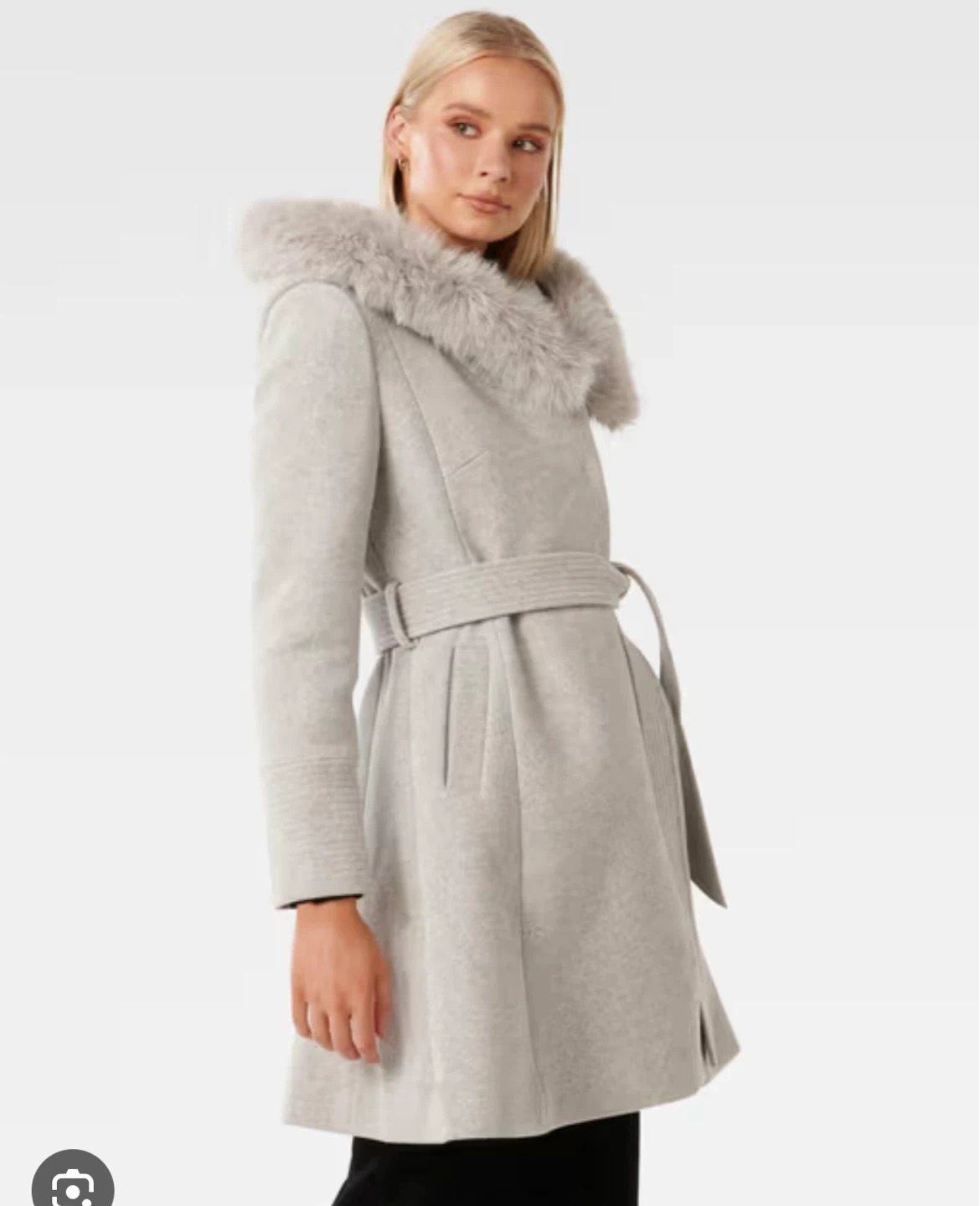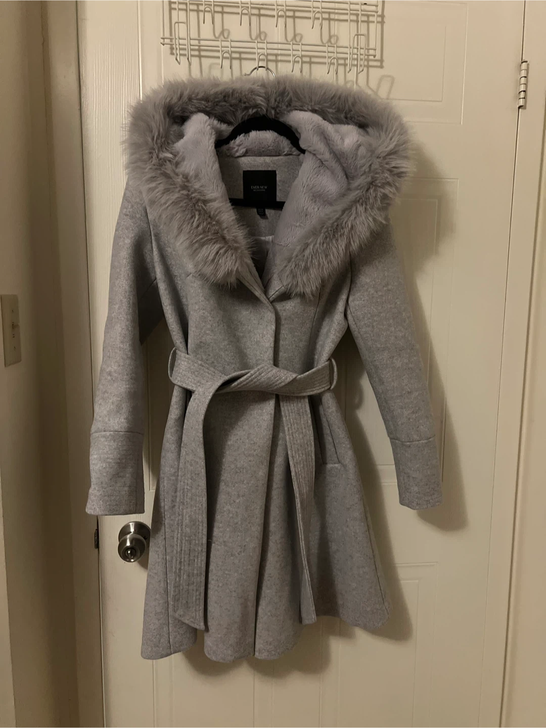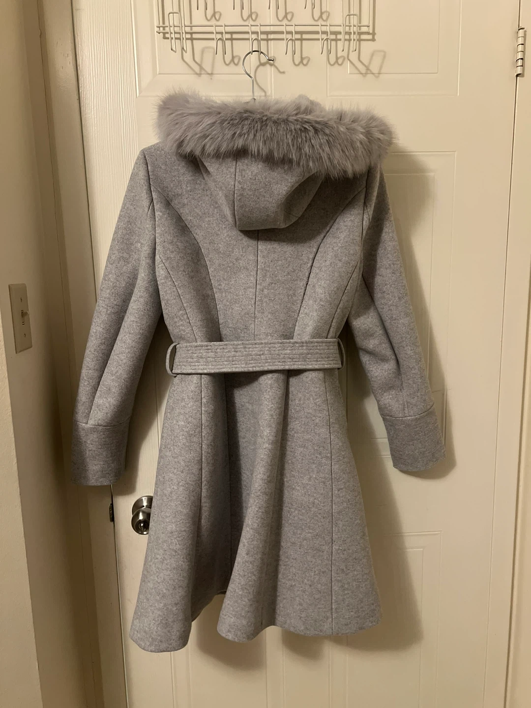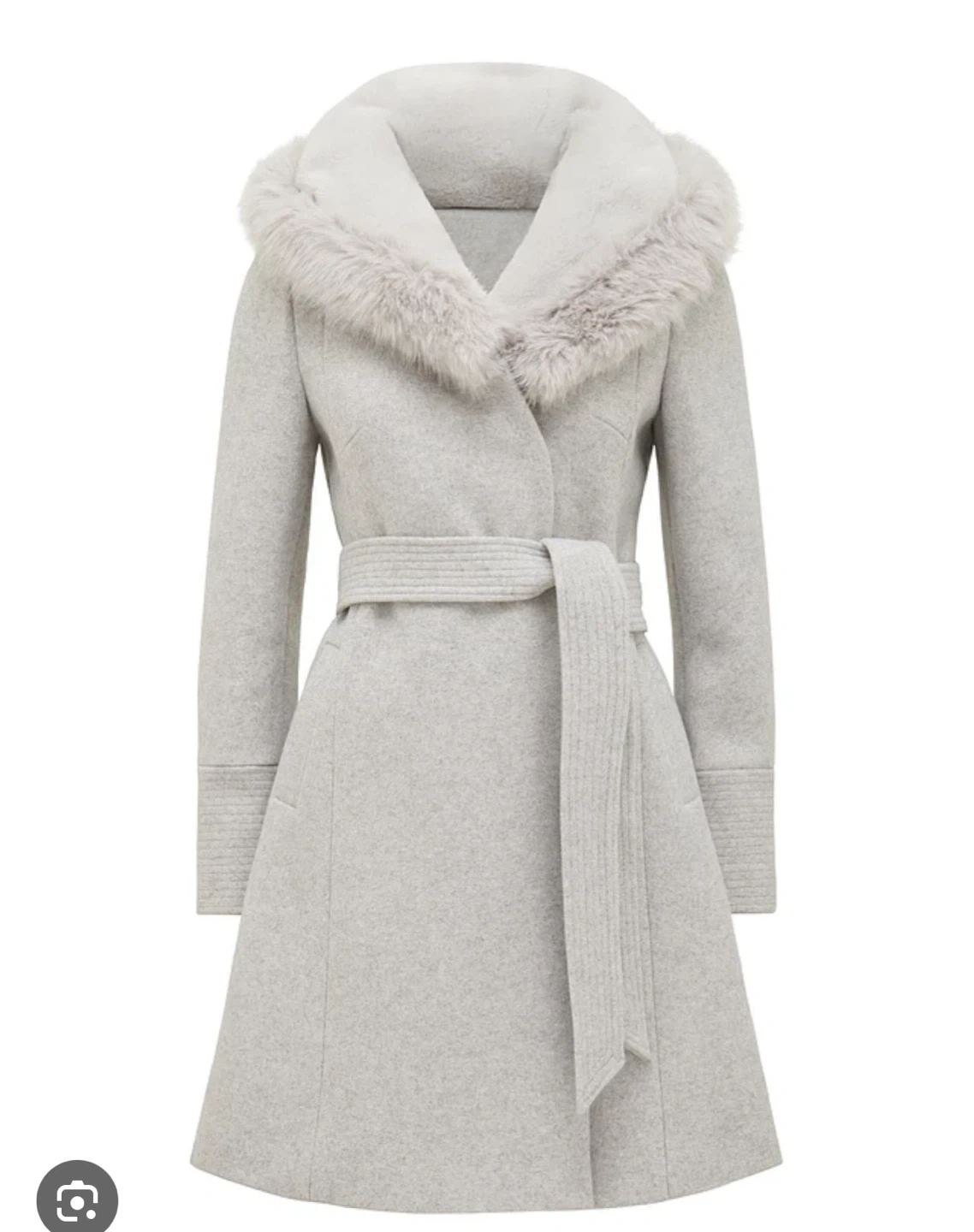 Size 6 ( worn once) excellent condition Grey color Framed by an elegant faux-fur trim and cinching waist tie, this coat adds a touch of glamour to everyday styling. Regular fit Warm wool blend fabrication Attached hood with faux fur trim Adjustable waist tie Belt loops Slightly flared hem Lined Main: 52% Polyester, 41% Acrylic, 7% Wool. Lining: 95% Polyester, 5% Elastane. Faux Fur Trim: 100% Polyester