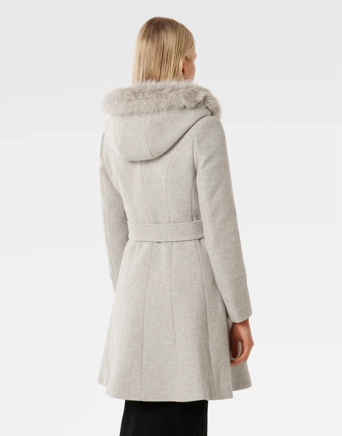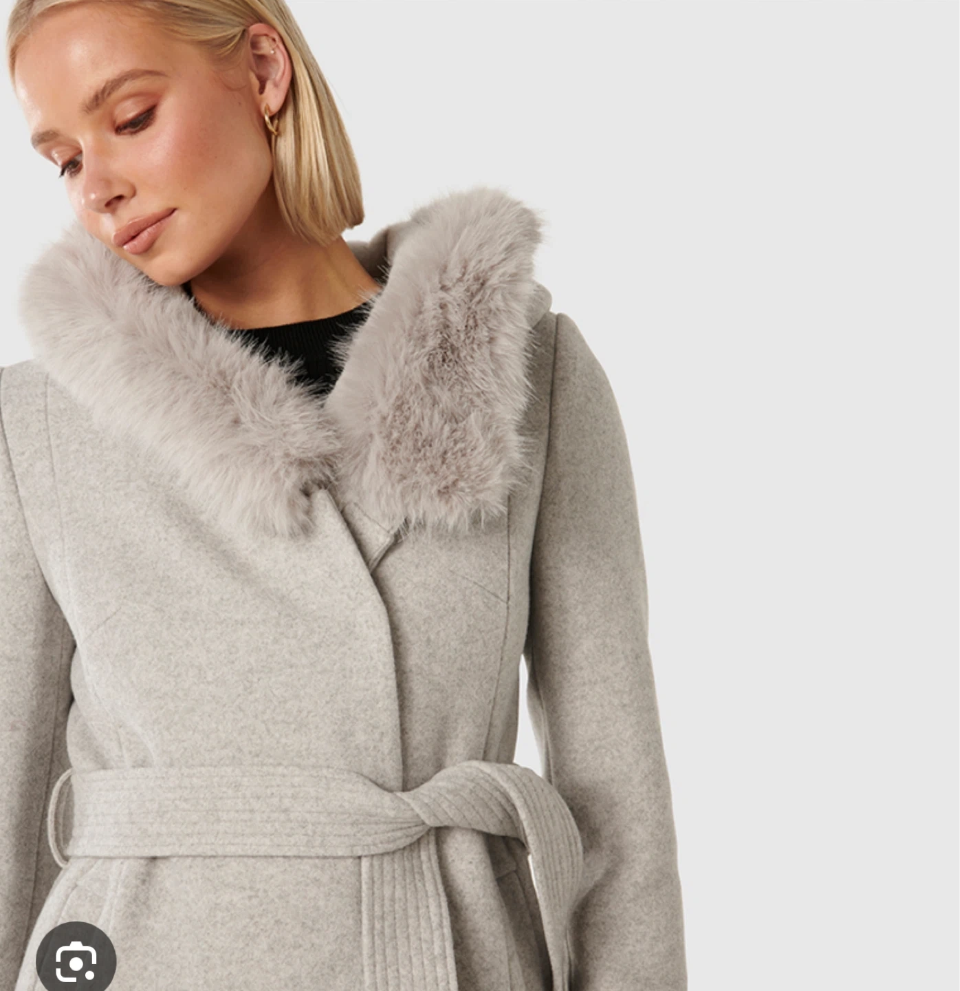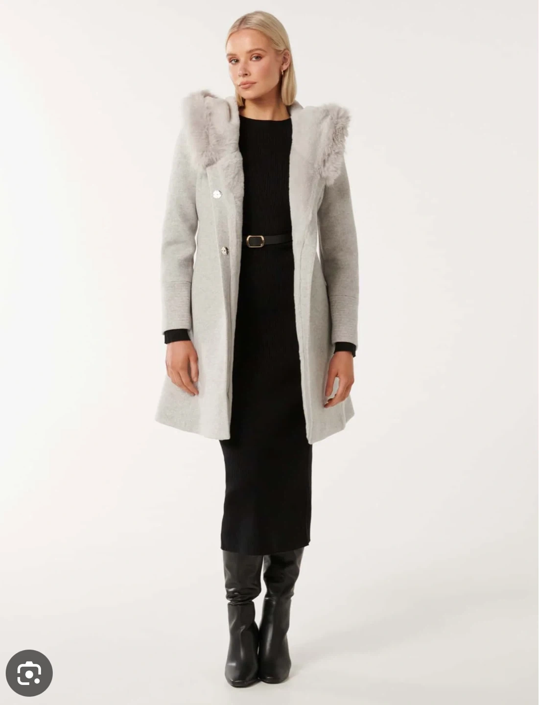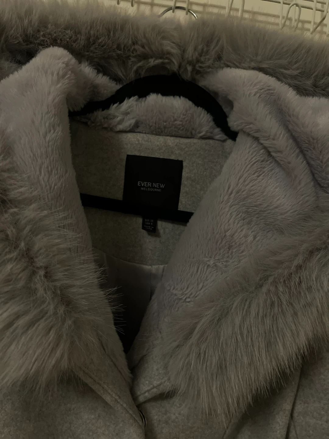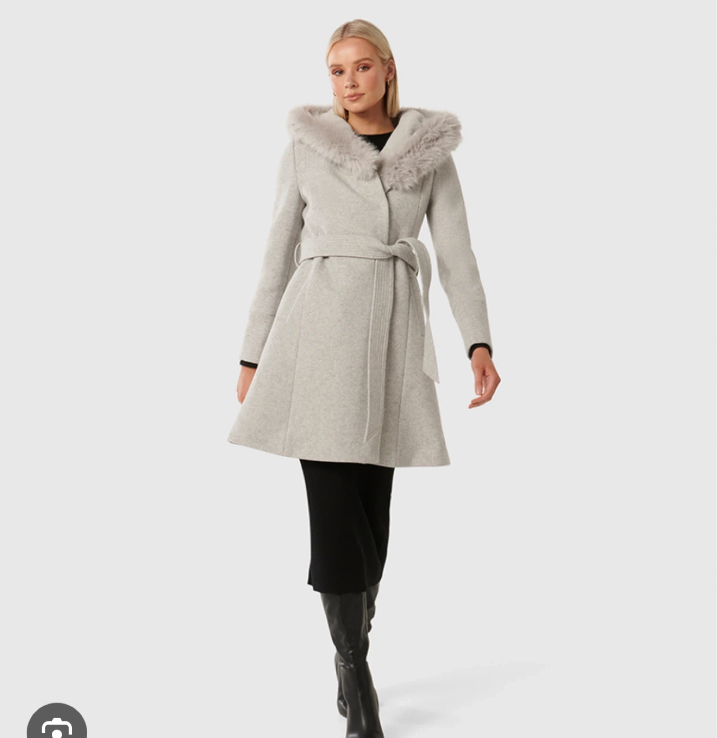 Size 6 ( worn once) excellent condition Grey color Framed by an elegant faux-fur trim and cinching waist tie, this coat adds a touch of glamour to everyday styling. Regular fit Warm wool blend fabrication Attached hood with faux fur trim Adjustable waist tie Belt loops Slightly flared hem Lined Main: 52% Polyester, 41% Acrylic, 7% Wool. Lining: 95% Polyester, 5% Elastane. Faux Fur Trim: 100% Polyester