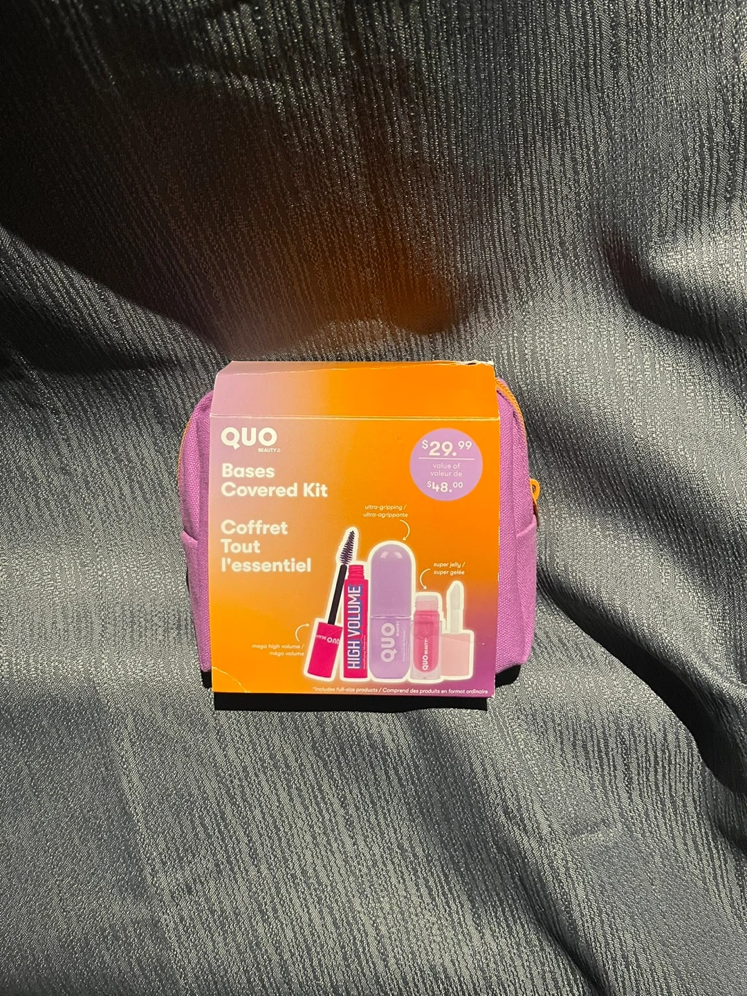 This is a Quo Beauty Bases Covered Kit. It includes a High Volume Amplifying Mascara (13ml) and a Milky Jelly Lip Gloss (4.5ml). Originally bought for $29.99. The kit comes in its original packaging