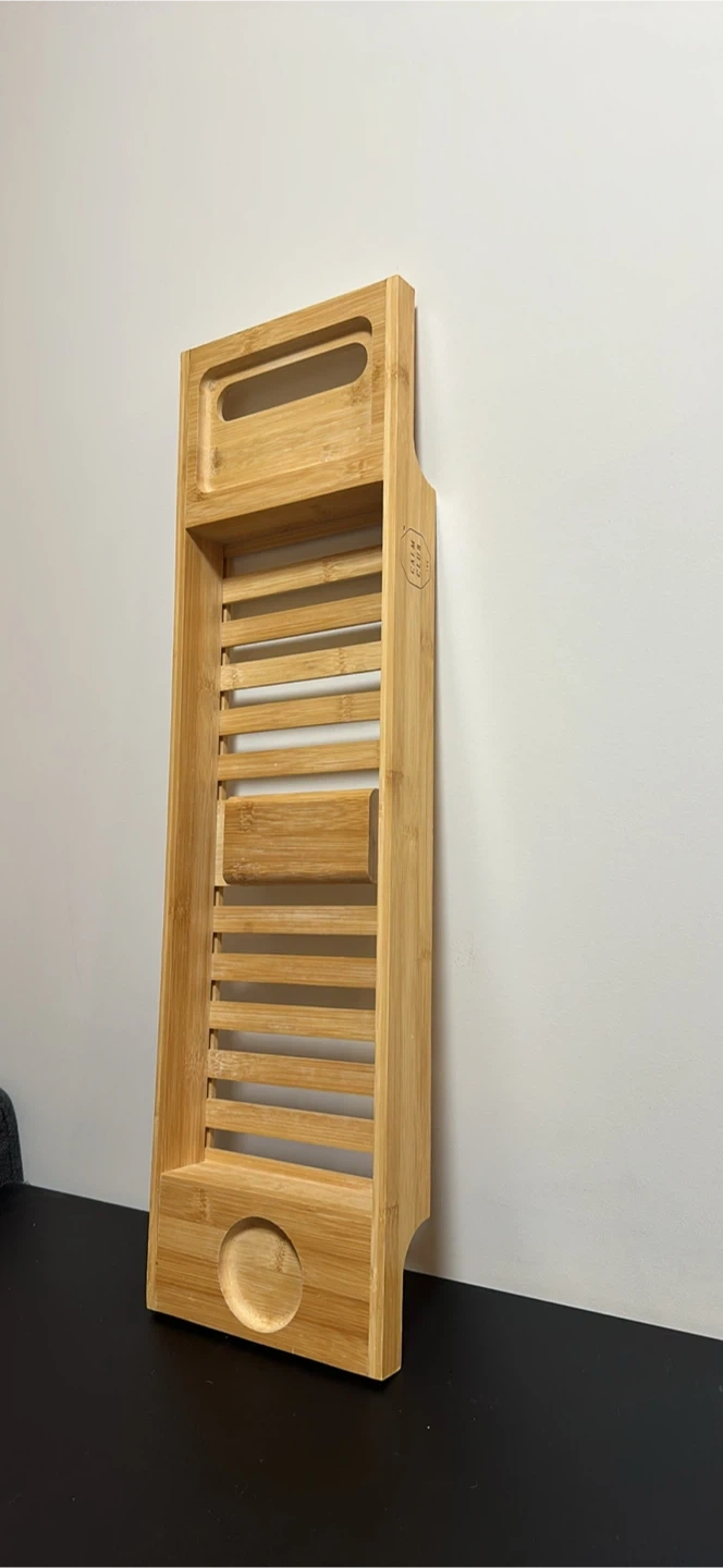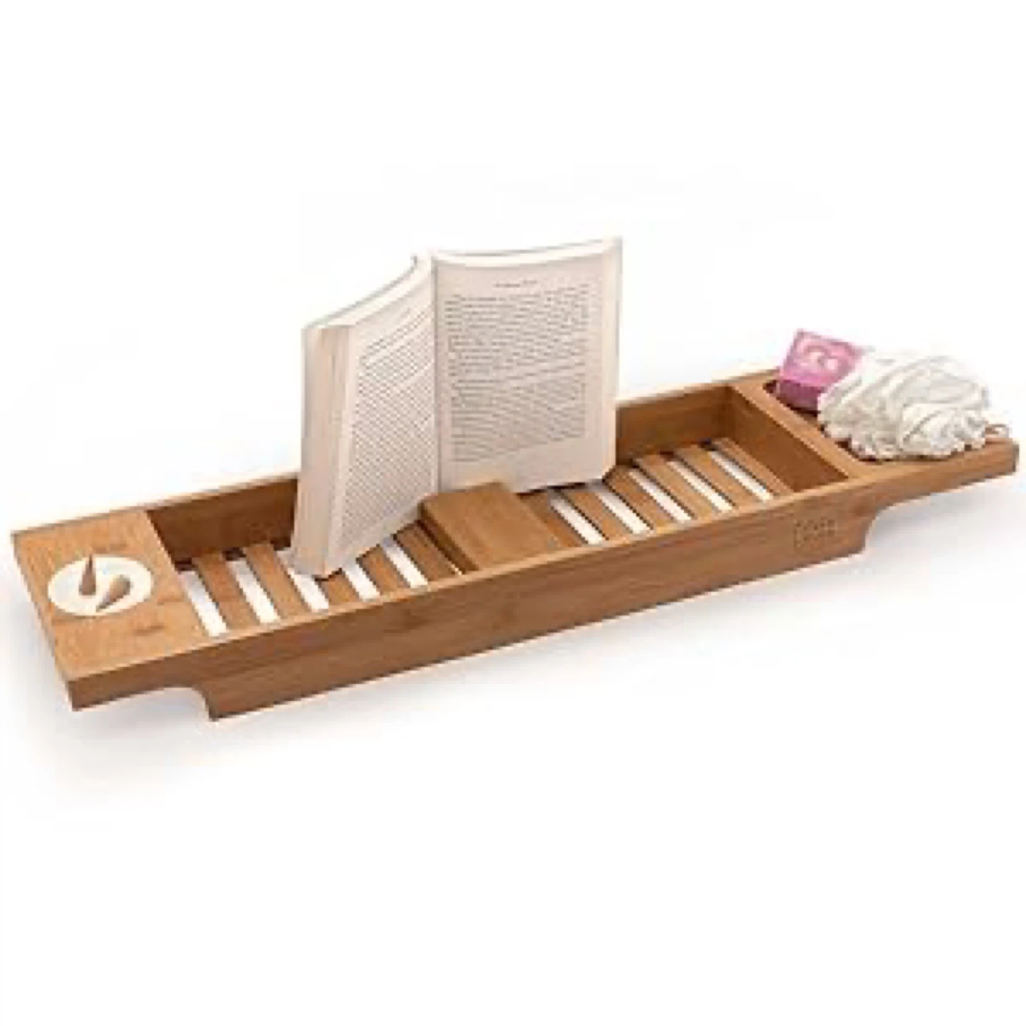 Looking to add a touch of spa luxury to your bath time? This Bambusi bathtub caddy tray is just the thing! It's made of beautiful bamboo and has a spot for everything you need to relax, like a book, a drink, and even your phone. It's in great condition and ready to bring some zen to your bathroom