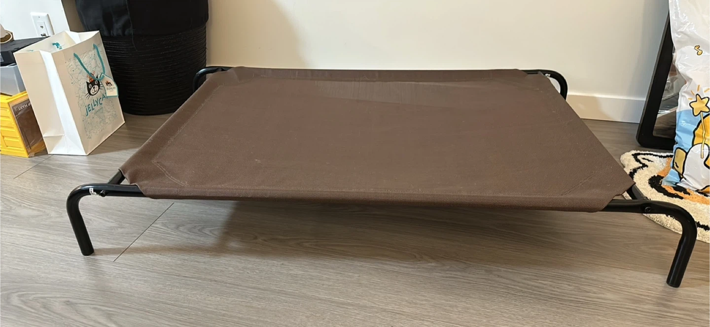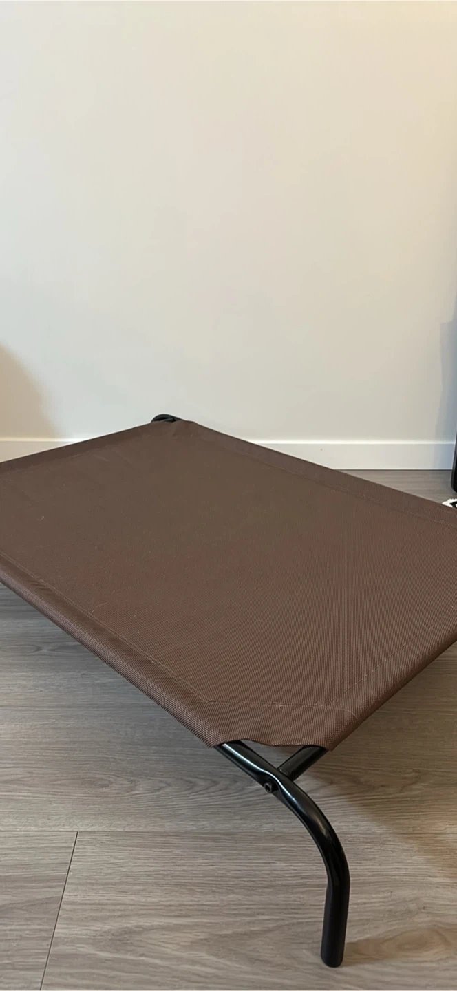 Selling a gently used elevated pet bed in brown. It's in great shape and perfect for keeping your furry friend cool and comfortable. The elevated design promotes airflow and provides support for your pet's joints. It's easy to clean and assemble too!