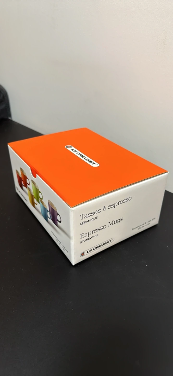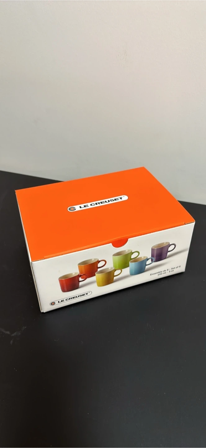 Selling a brand new set of Le Creuset espresso mugs! This set includes six stoneware mugs, perfect for enjoying your favourite espresso. The mugs come in a variety of vibrant colours. The box is included!