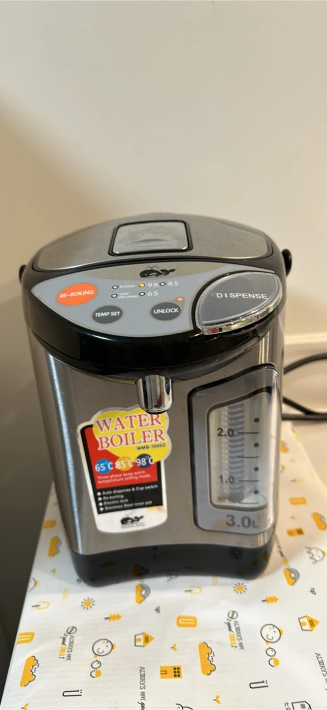 Selling a Whale Elec water boiler with a 3.0L capacity. It features three-phase keep warm temperature setting modes at 65°C, 85°C, and 98°C. It also has auto dispense & cup switch, re-boiling, electric lock, and a stainless steel inner pot