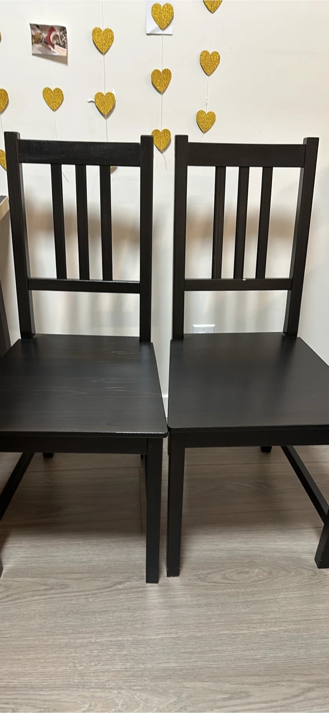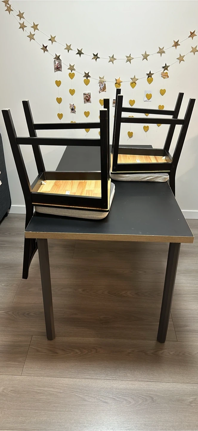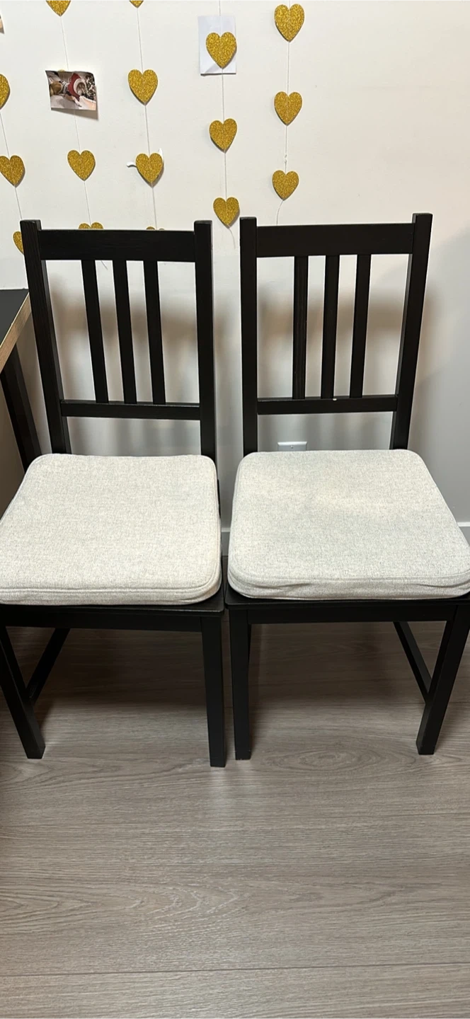 Selling a set of IKEA dining table and Ingolf chairs in black! They're in great shape and come with comfy seat cushions. Perfect for adding a touch of classic style to your dining area or kitchen. Chairs are in perfect conditions. There are some scratches on the dining table. However, everything works well. One table, two chairs, two chair cushions