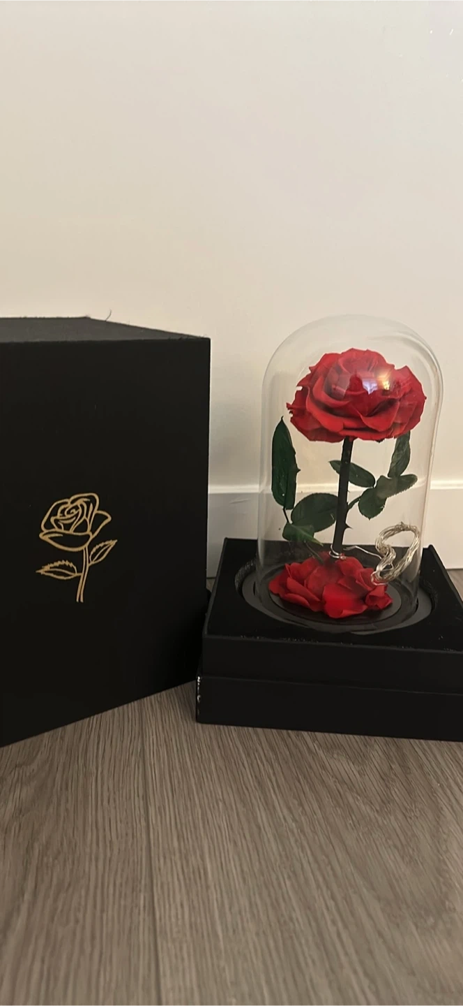 Selling a beautiful 'Beauty and the Beast' inspired rose in a glass dome. It comes with its original box, making it perfect for gifting or as a decorative piece for your home