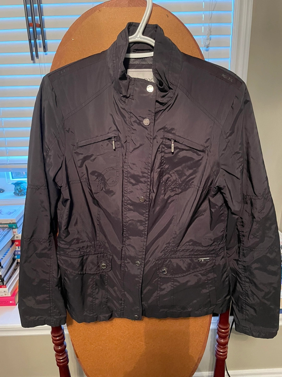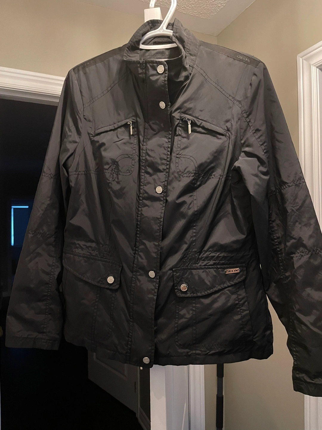Selling a stylish Geox black jacket. It's in great condition and perfect for layering! The jacket features multiple pockets and a comfortable fit.