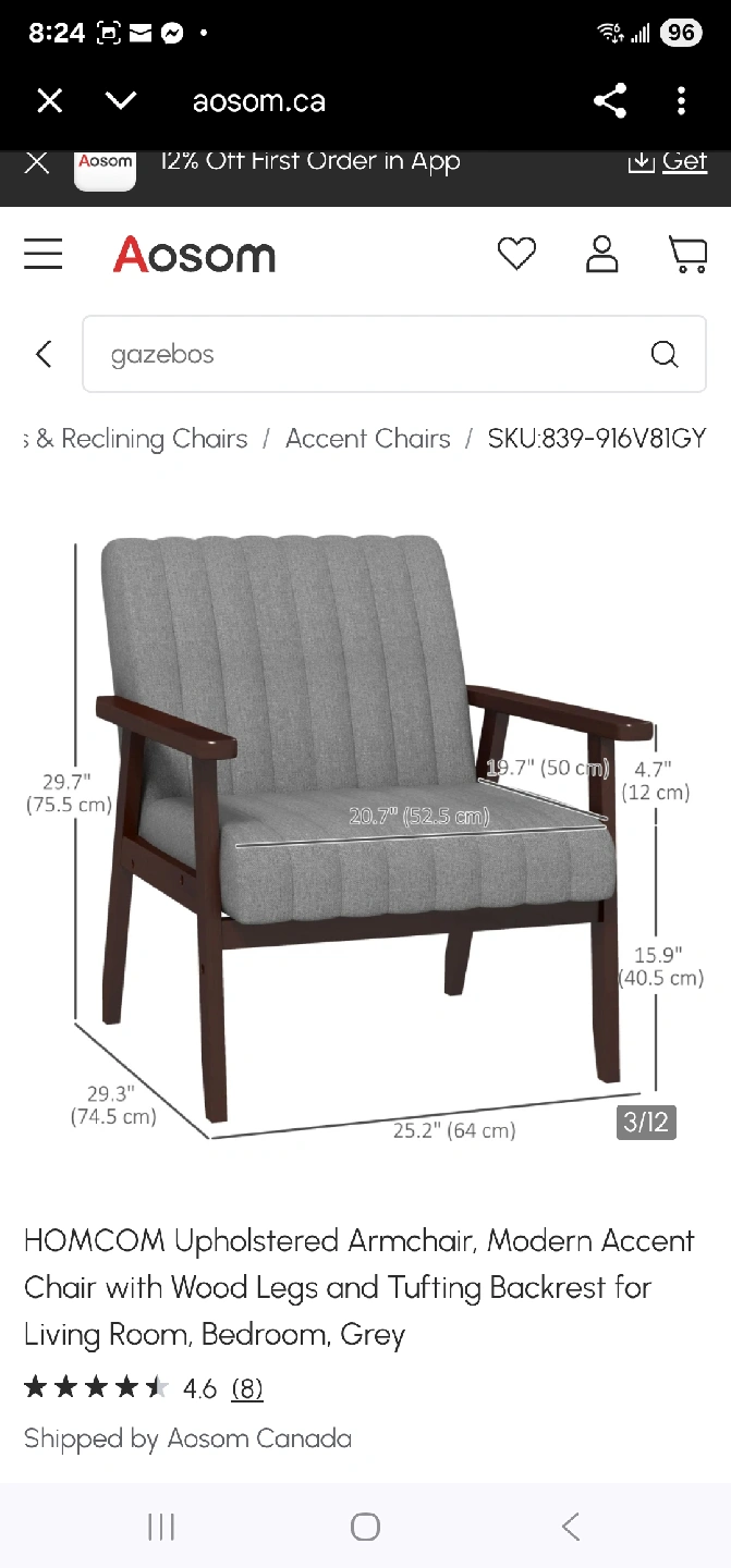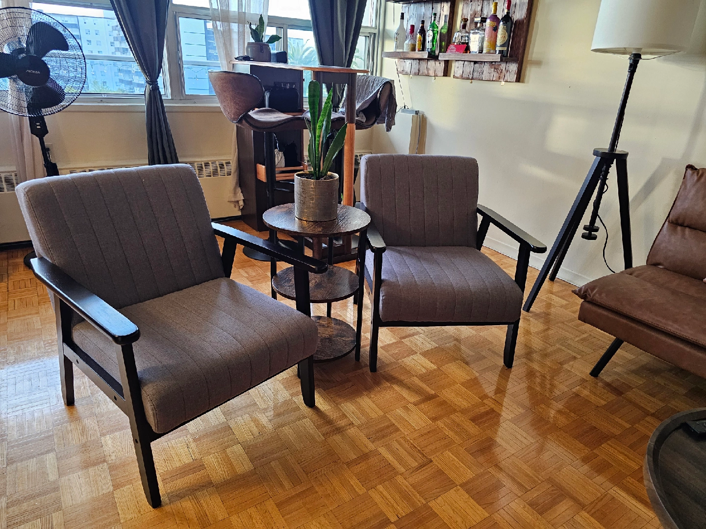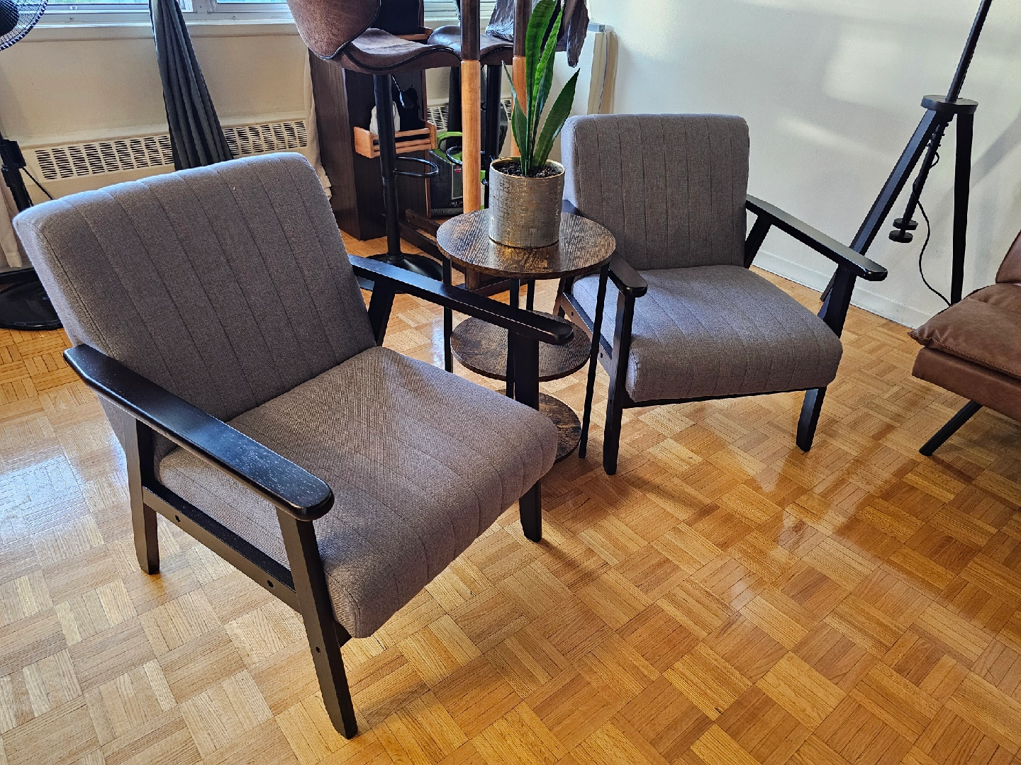 Looking to add a touch of modern flair to your living space? I'm selling a HOMCOM upholstered armchair in grey. It's a stylish accent chair with wood legs and a tufted backrest, perfect for the living room or bedroom. The chair features a linen-feel fabric and a thick padded cushion for high comfort. Dimensions are approximately 29.7" (75.5 cm) in height, 25.2" (64 cm) in width, and 29.3" (74.5 cm) in depth. Just bought it 3 days ago. Still in brand new condition.