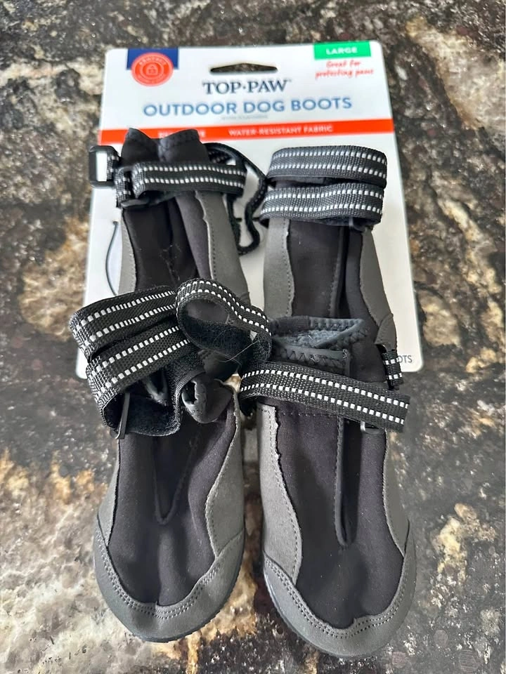Brand new dog booties, size large. Never used, but my dog ran outside and there is a bit of grass stuck in the Velcro.