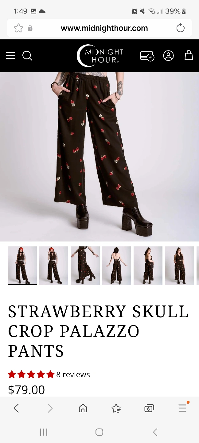 Selling a pair of Midnight Hour Strawberry Skull Palazzo Pants. They are black with a strawberry skull pattern. They are cropped but not if you're short (I'm 5'3 and they're regular length on me) They didn't fit my waist but the return window is closed π I absolutely LOVE them and would like to recoup my money to buy the correct size. Size chart in photos, linen type material so minimal stretch but have an elastic waistband Brand new with tag. I paid $83.50 plus customs. Pick up East London