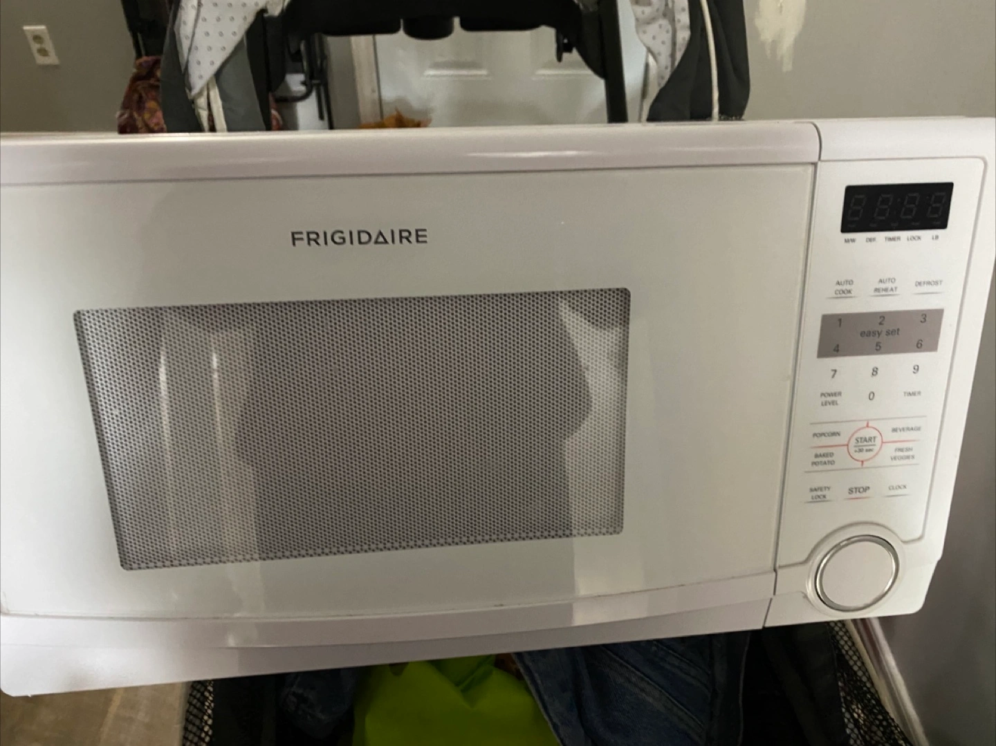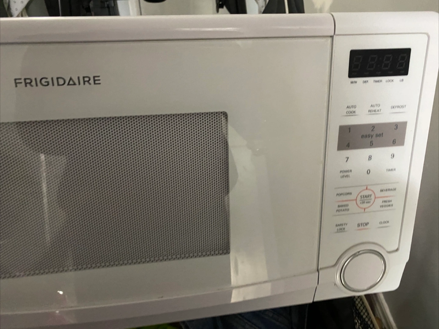 Selling a Frigidaire microwave in white. It's in great condition and ready to heat up your meals. Features include auto cook, auto reheat, and defrost settings. Also has a timer and a safety lock for added convenience