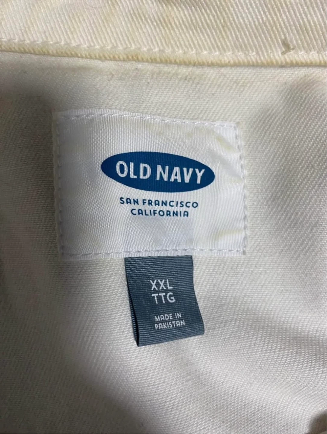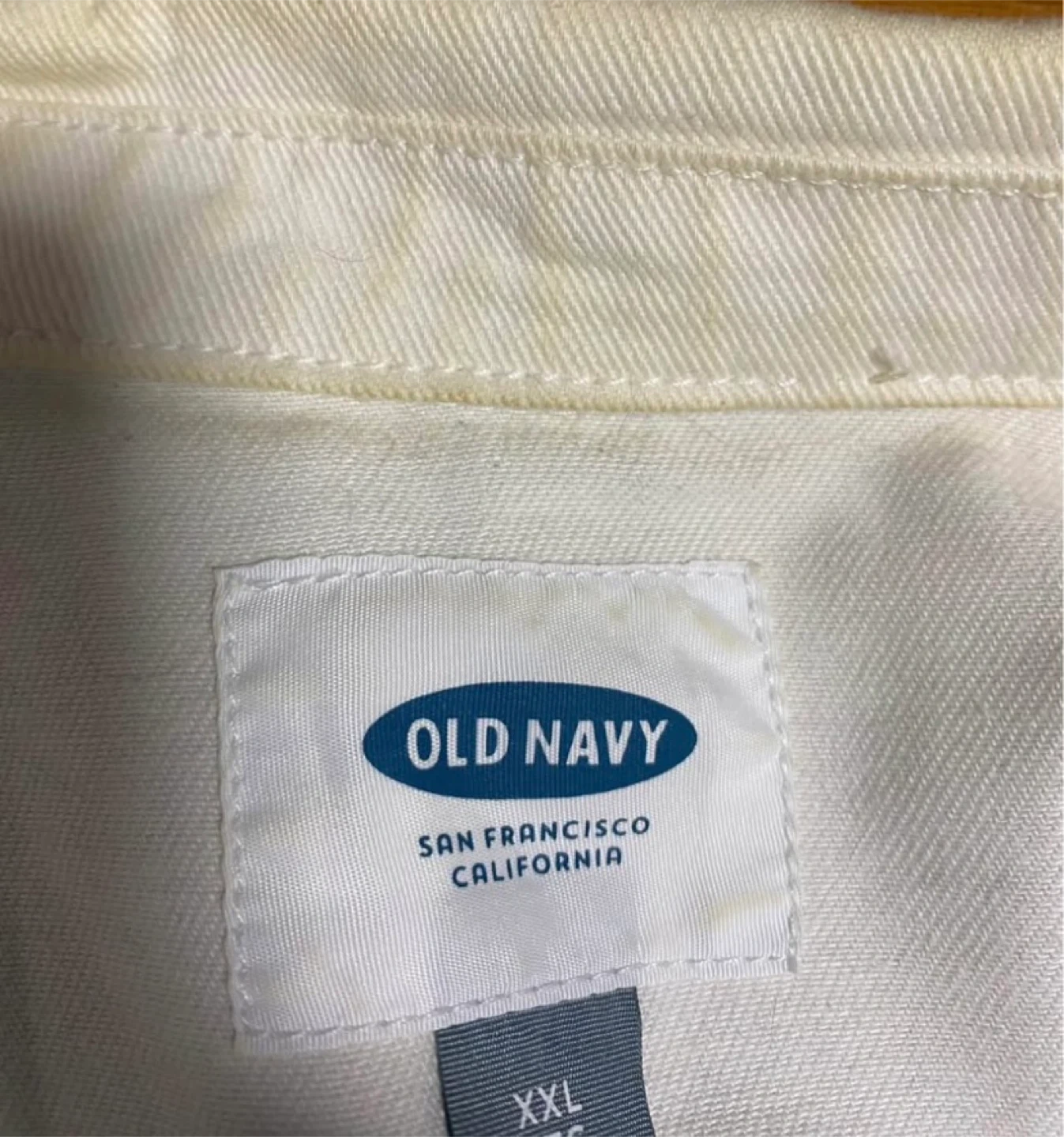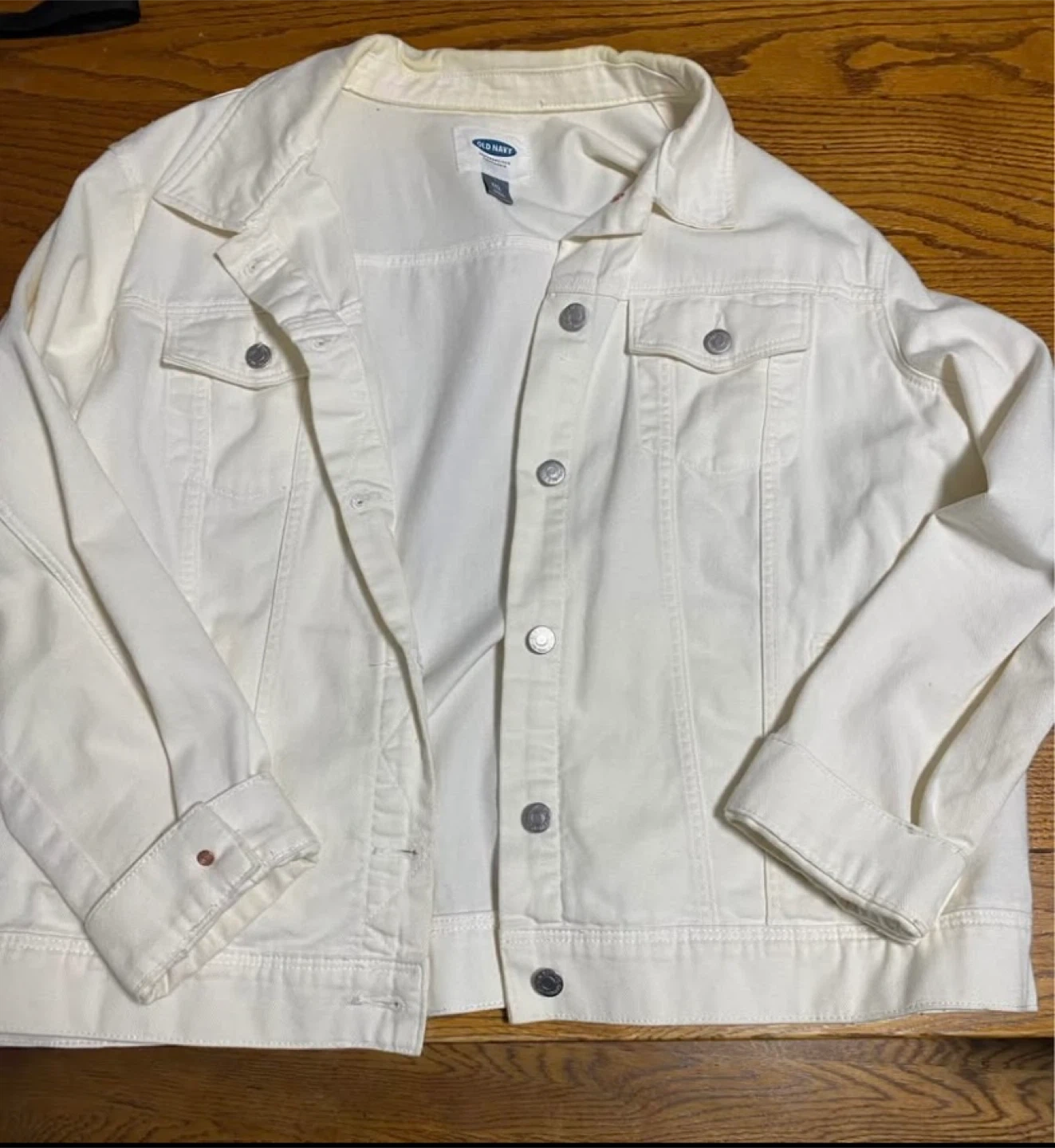 Selling a gently used Old Navy denim jacket in white. It's a size XXL. There's a small stain on the sleeve, but otherwise it's in good condition!