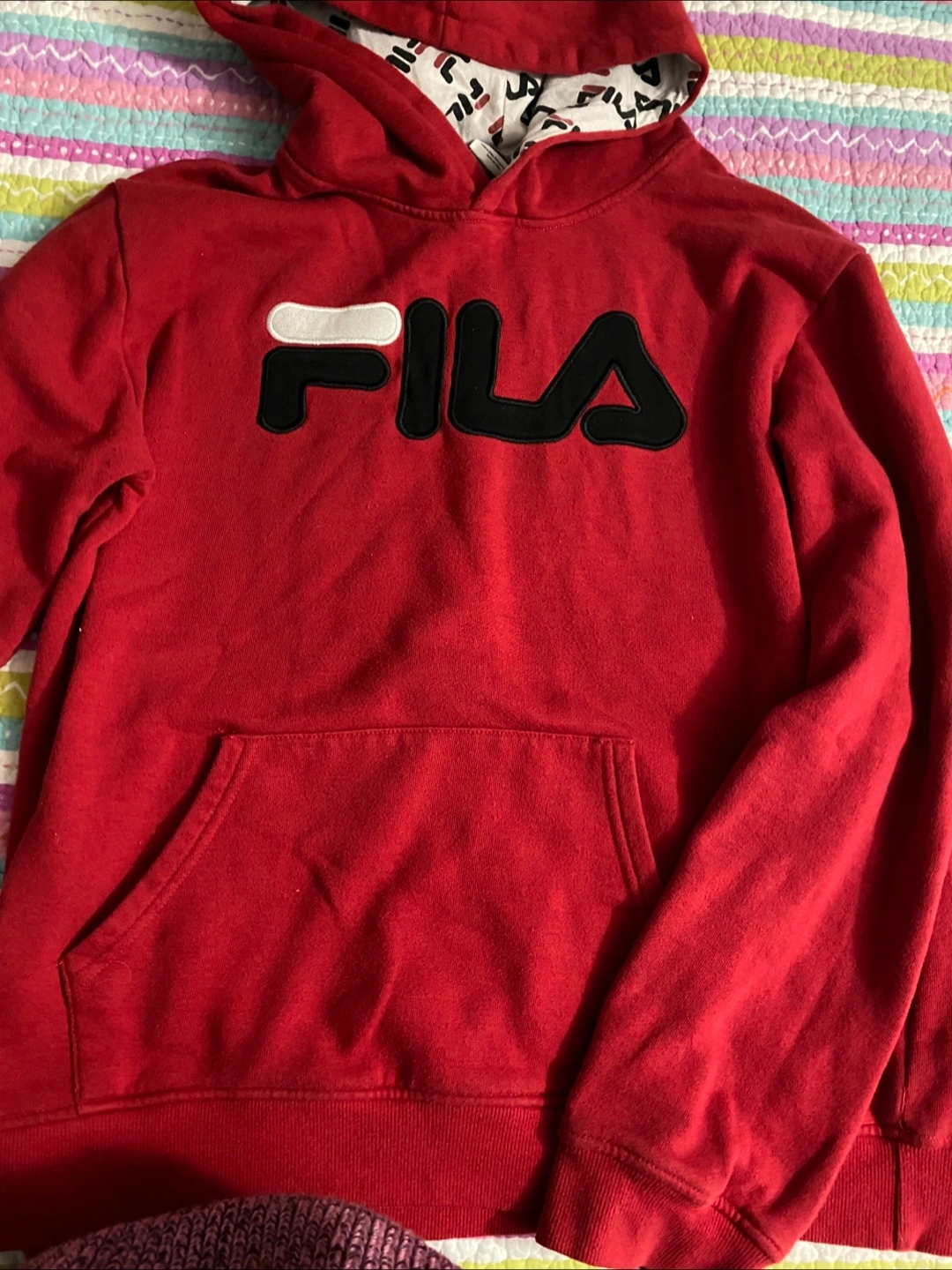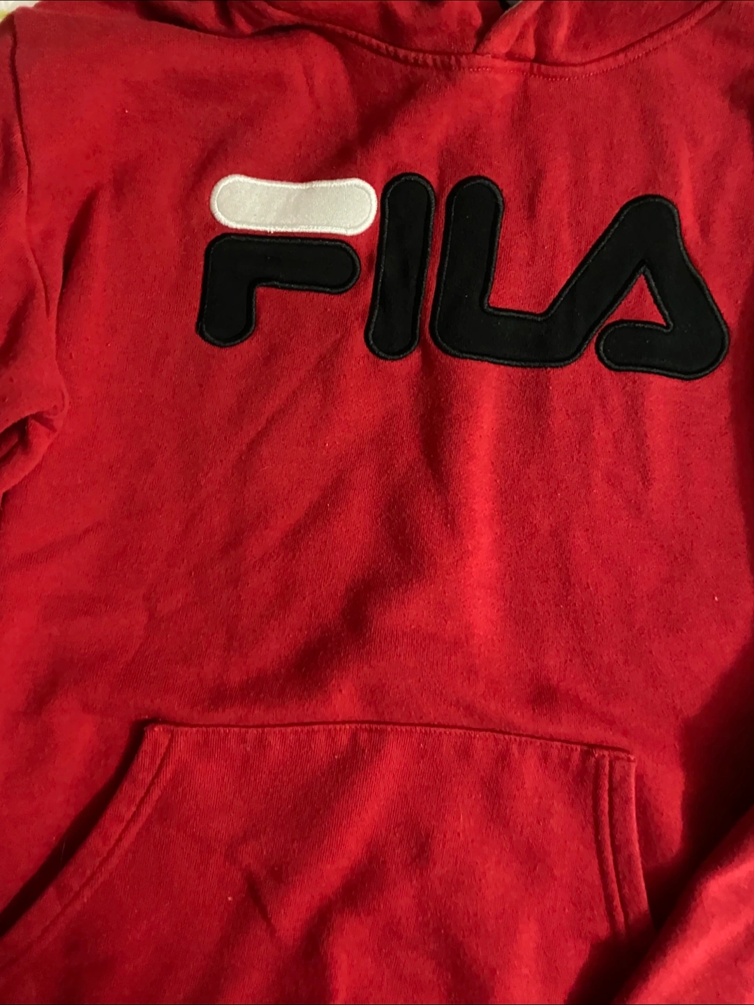 Red Fila hoodie in good condition! It has a classic design with the Fila logo on the front and a hood. Perfect for casual wear