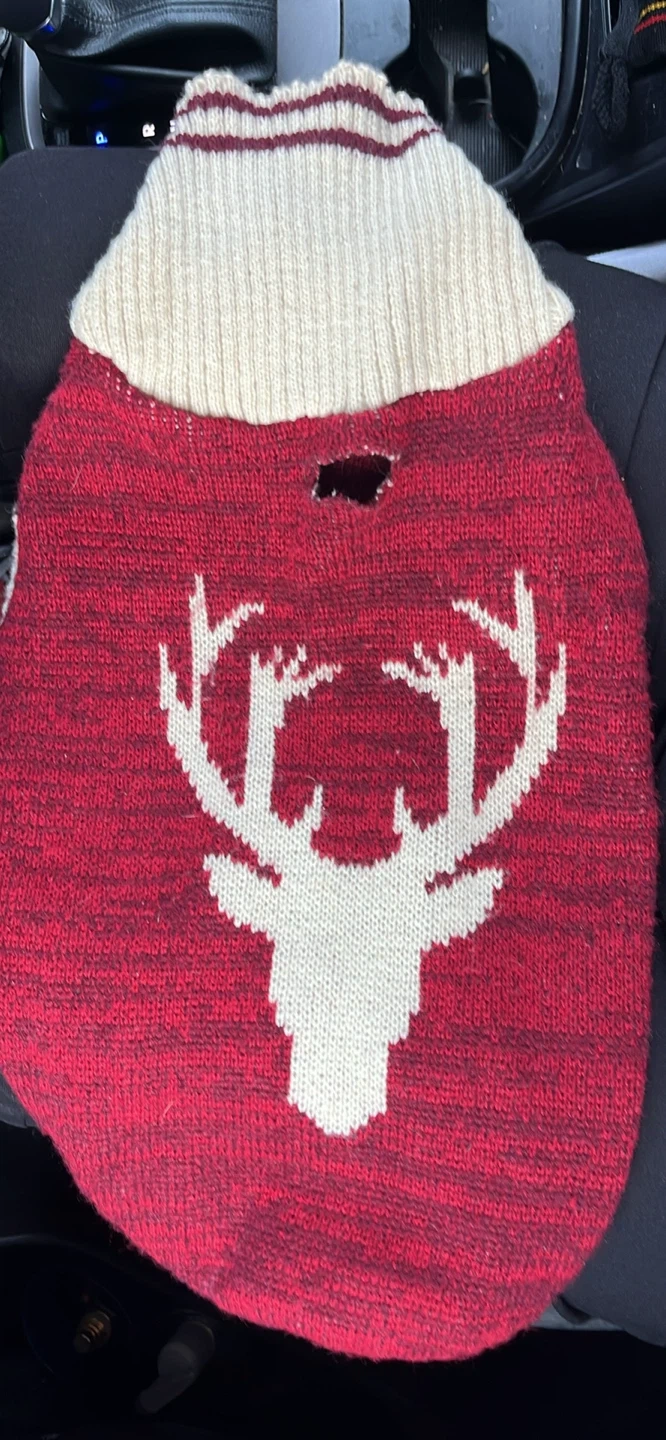 Snuggly dog sweater with a festive reindeer design! It's red and cream coloured with a hole for a leash. Perfect for keeping your furry friend warm during those chilly walks Used it for our dog as a puppy , 20lbs approx