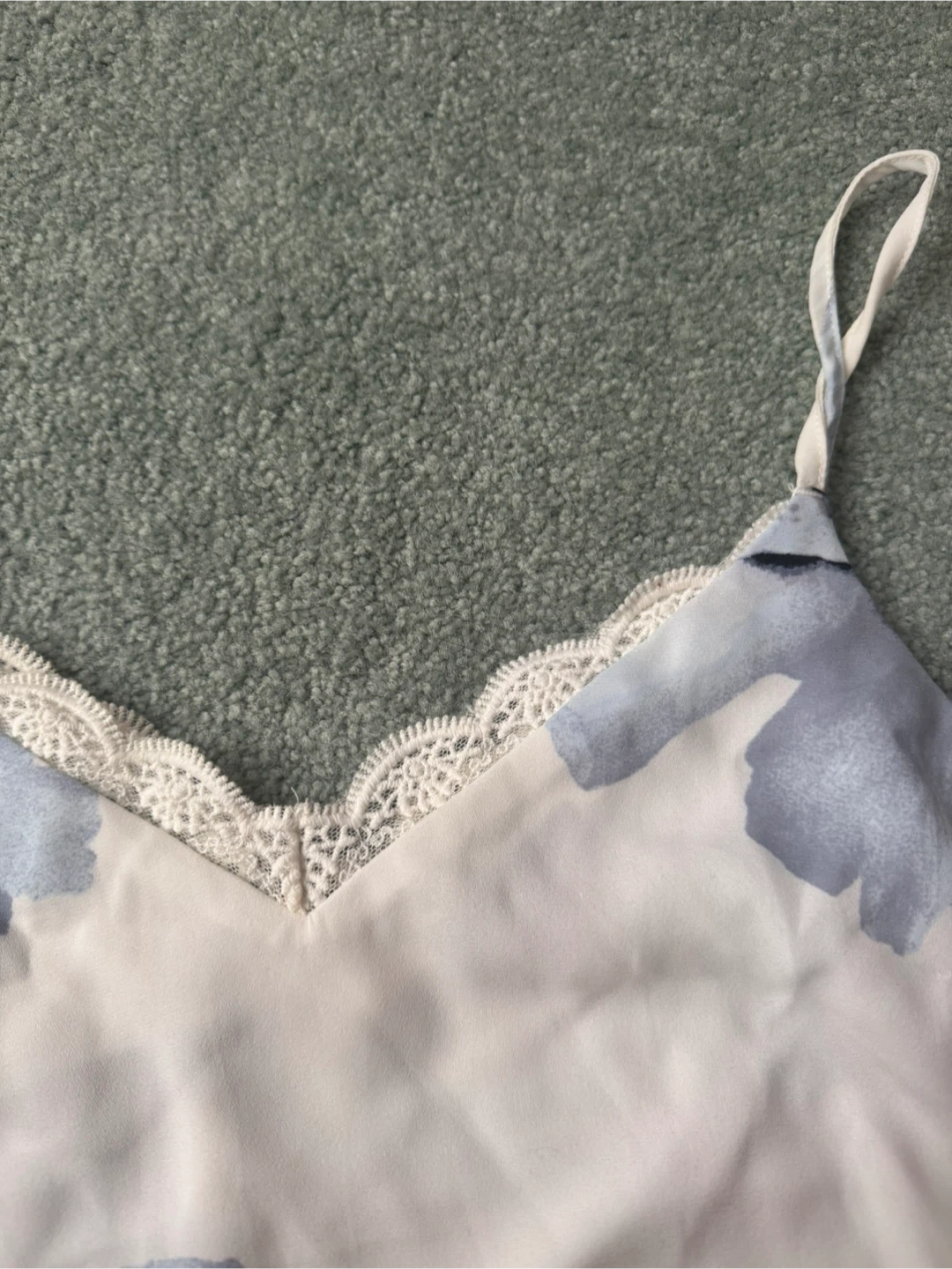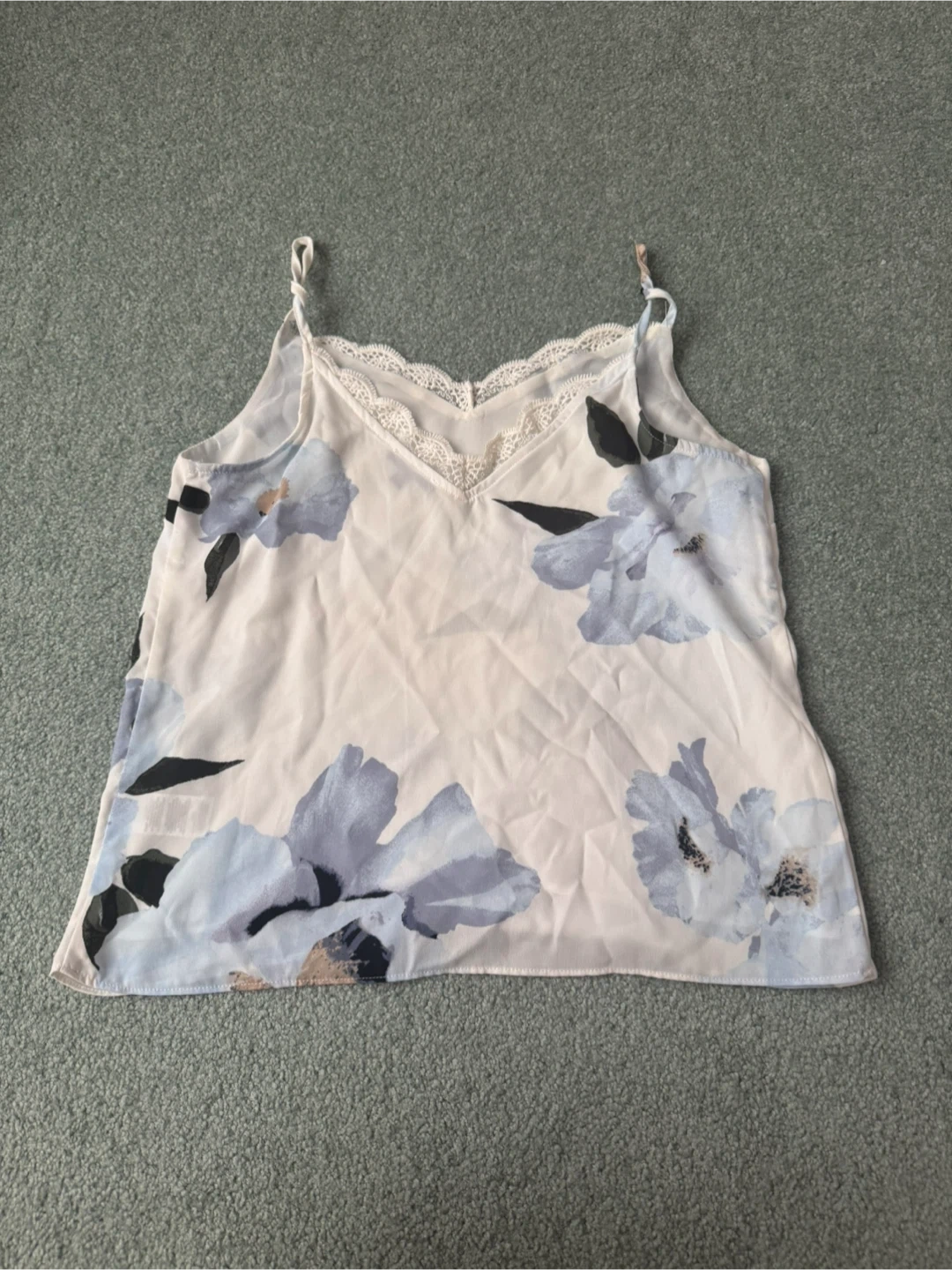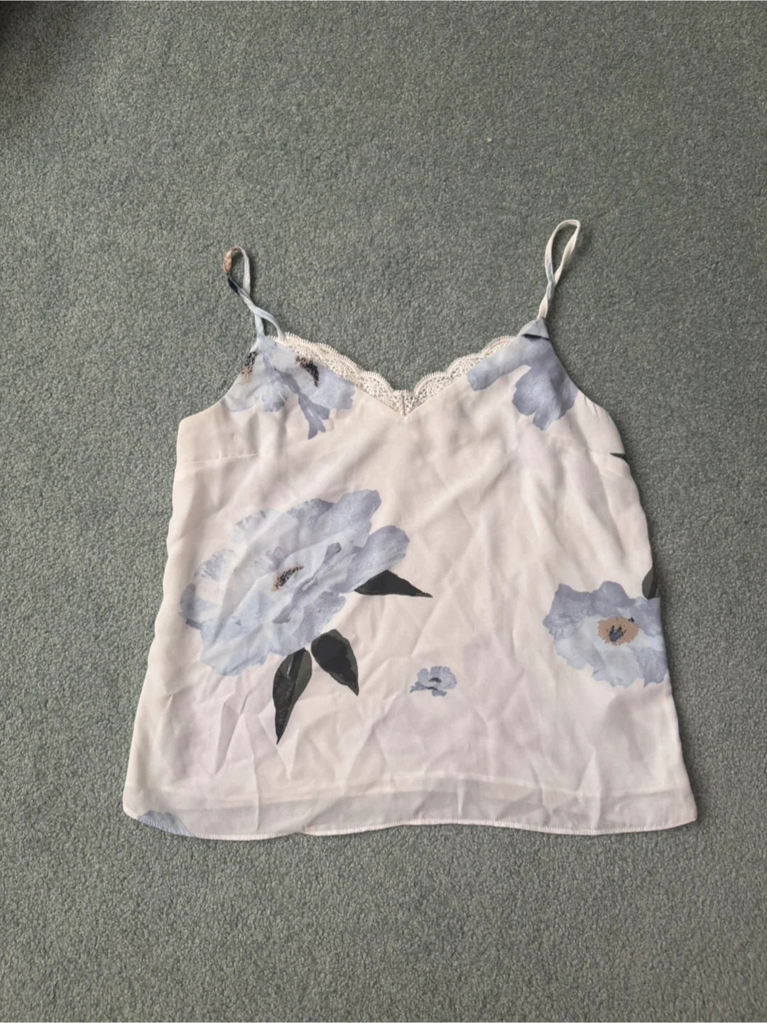 Selling a cute cami top with a floral print! It's a size small and in great condition. Perfect for layering or wearing on its own during warmer weather. The top features delicate lace trim along the neckline.