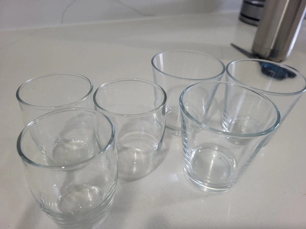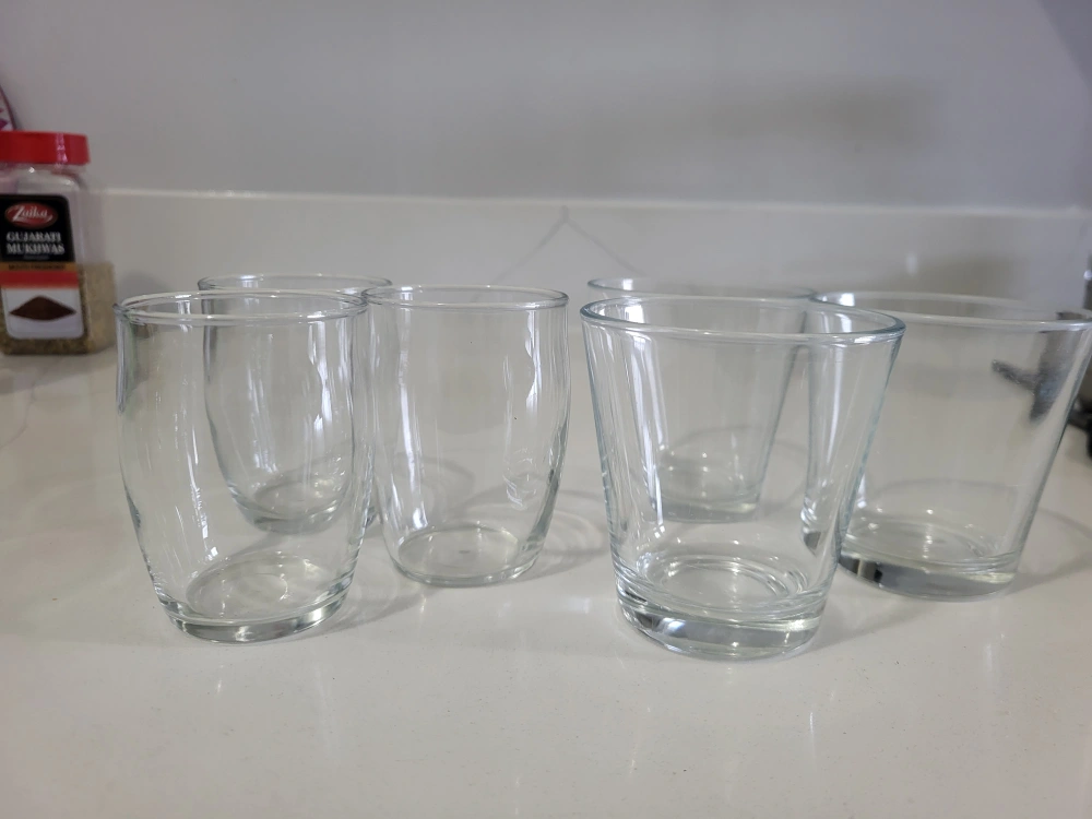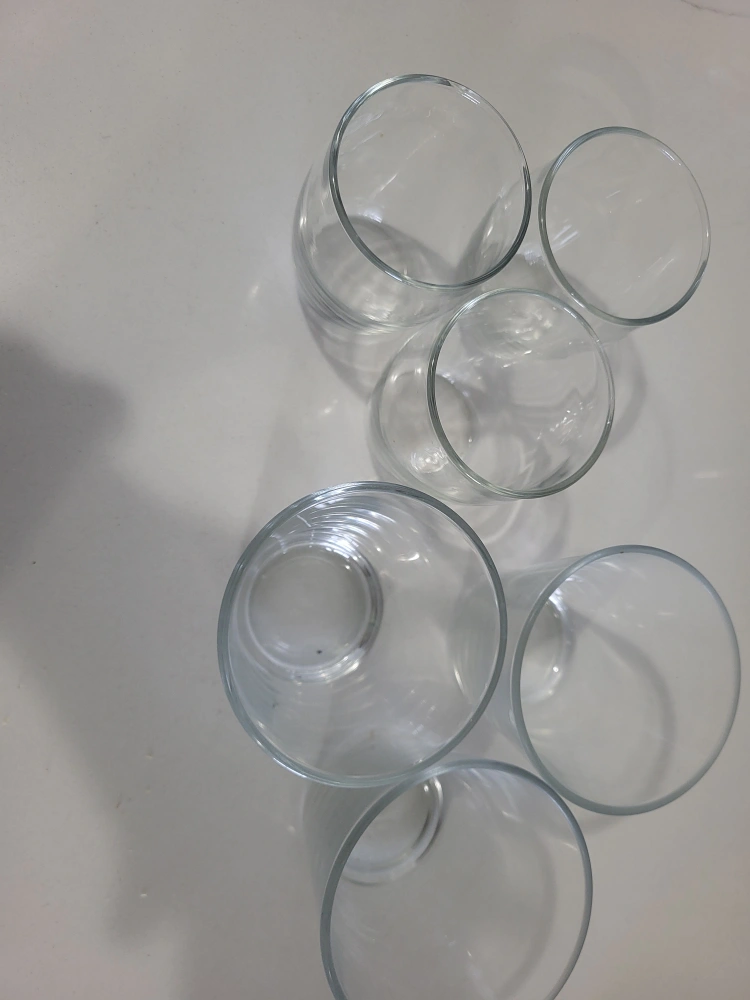 Selling a set of 6 clear drinking glasses. They are in great condition and perfect for everyday use! They're simple and elegant, fitting into any kitchen or dining setting