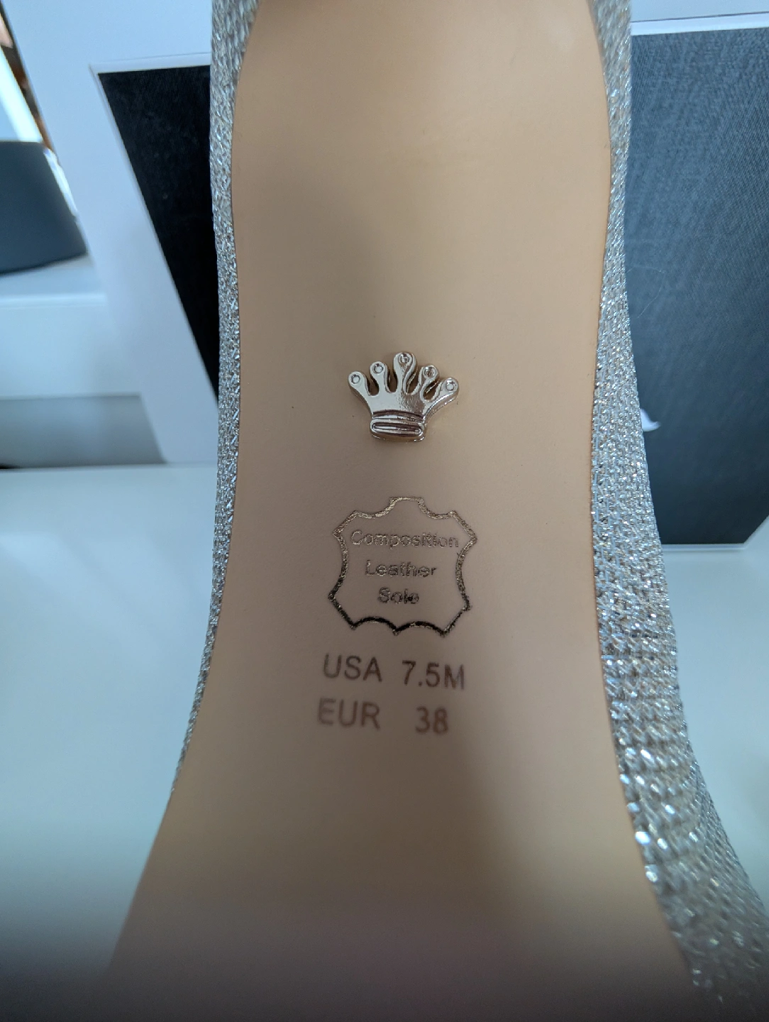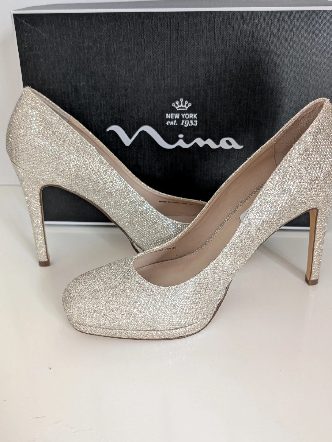 These beautiful Nina New York heels are perfect for a special occasion! They are a size 7.5M and come in a lovely silver colour. The soles are leather, and they come with the original box
