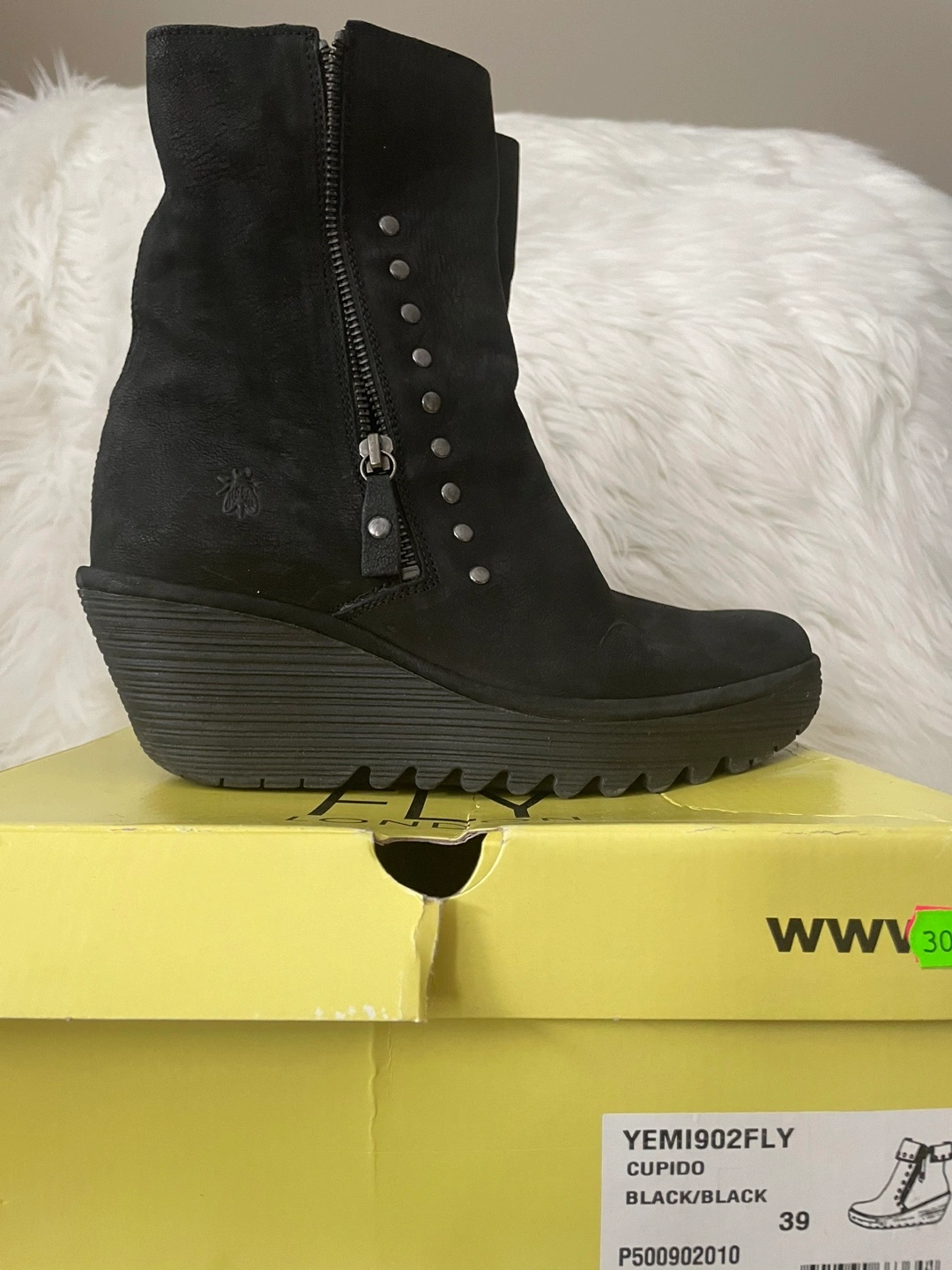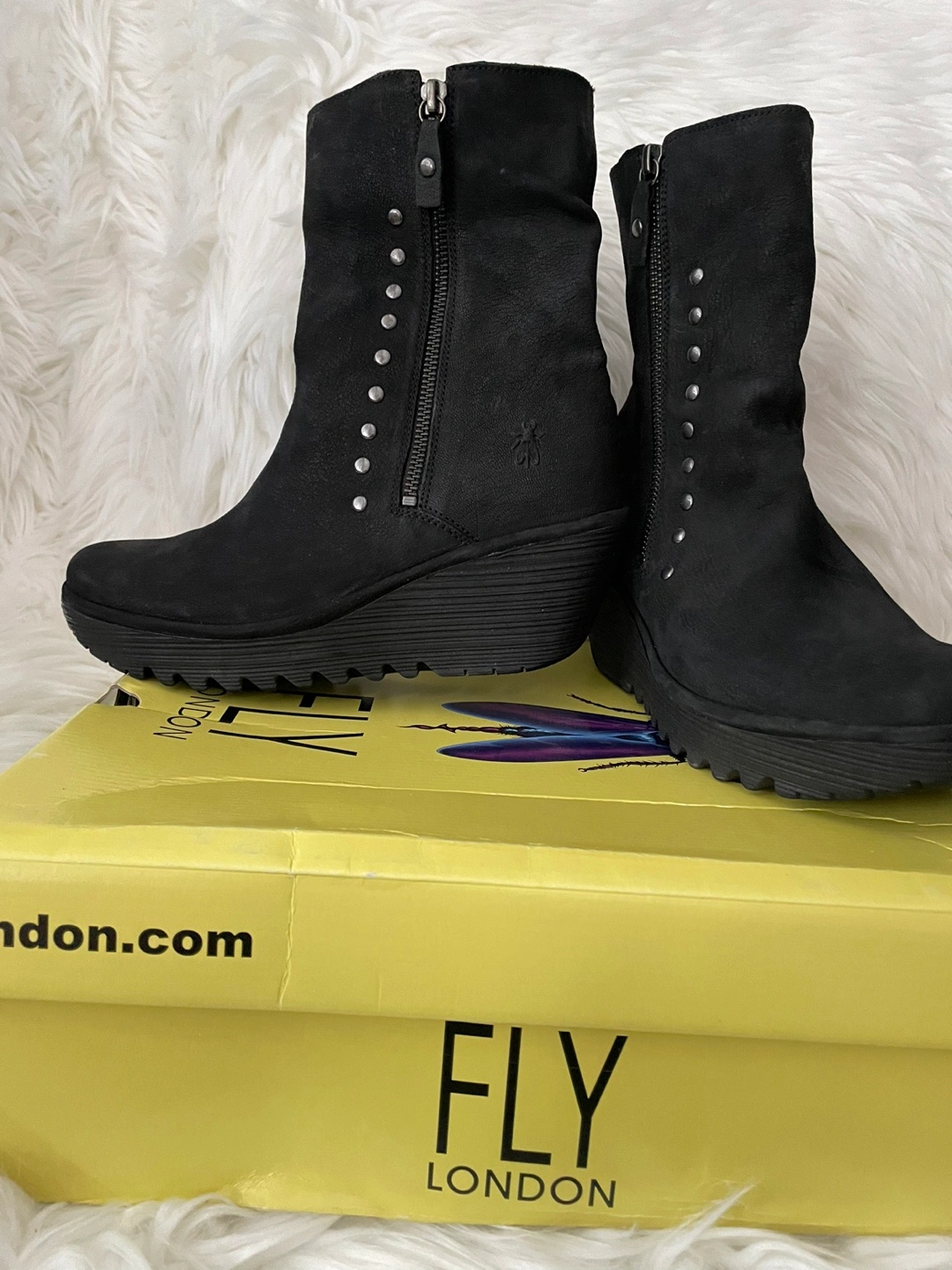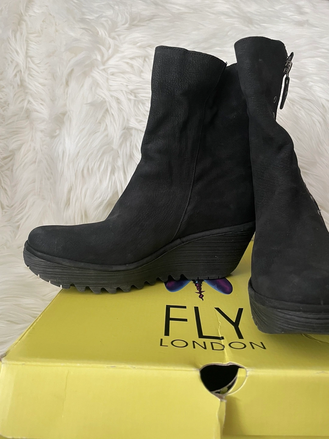 Selling a pair of Fly London wedge boots in black! These stylish boots are new and come with the original box. They are a European size 39, which is approximately a US size 8.5-9.