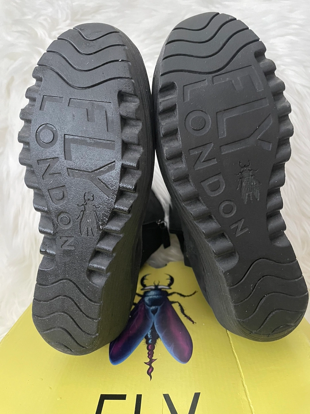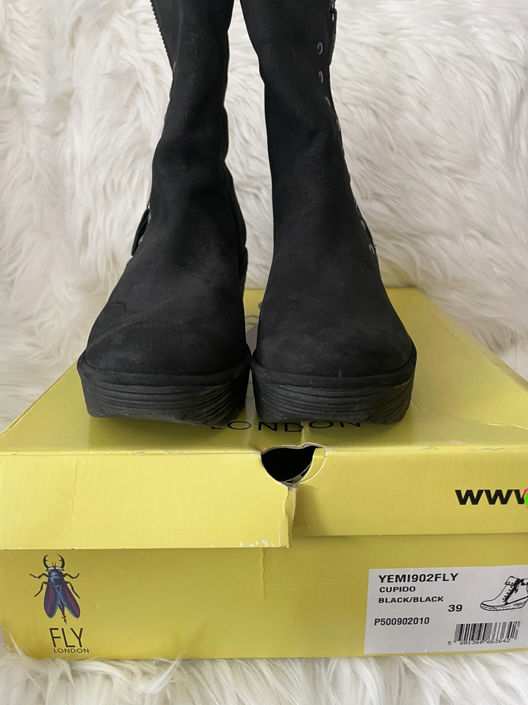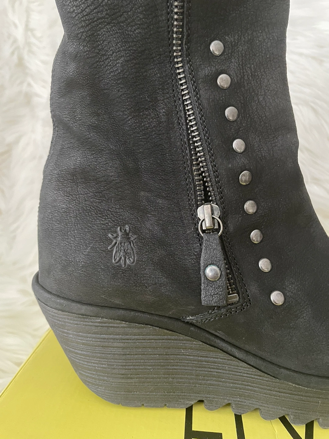 Selling a pair of Fly London wedge boots in black! These stylish boots are new and come with the original box. They are a European size 39, which is approximately a US size 8.5-9.