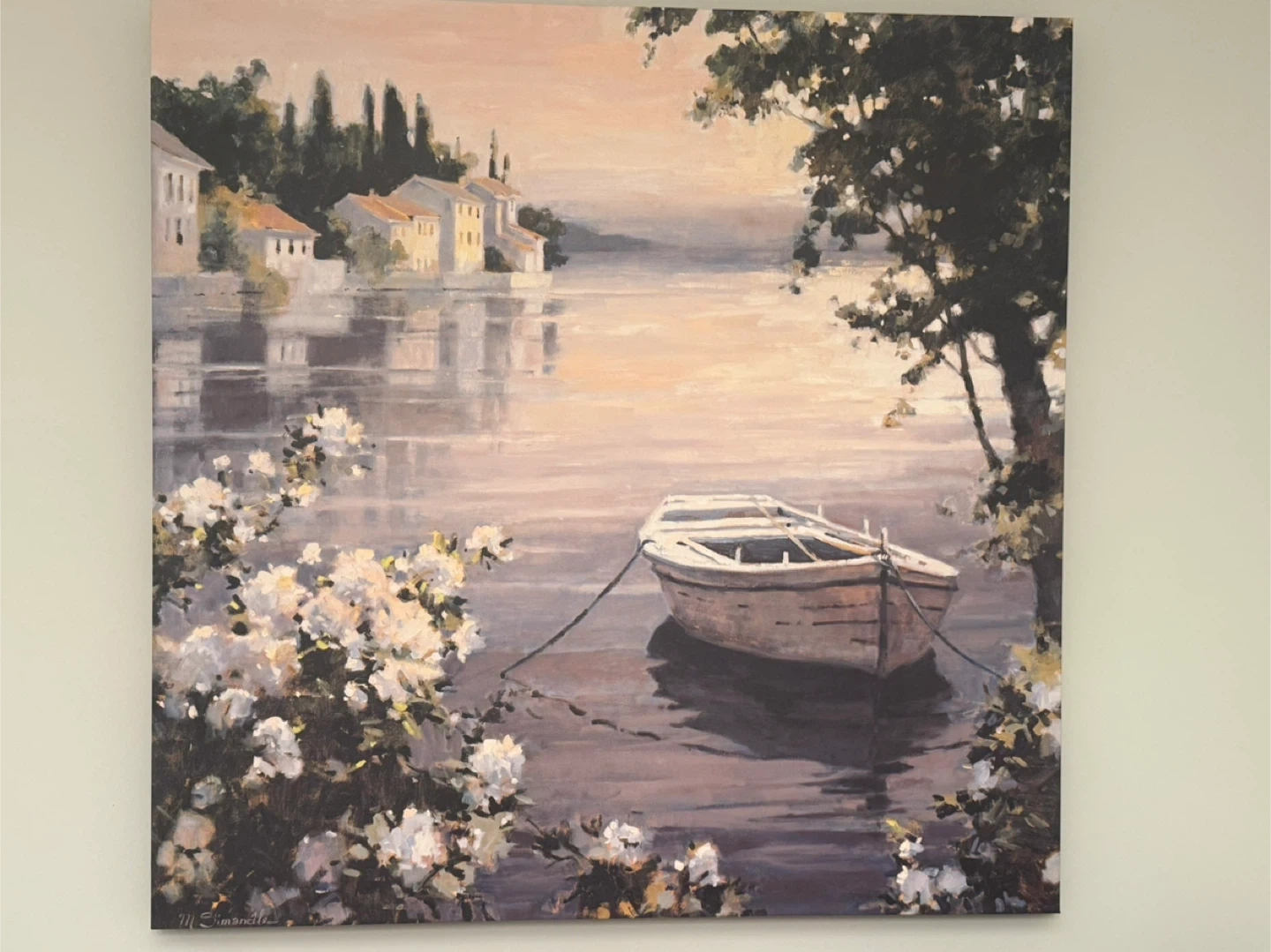 Beautiful painting of a lake with a boat and houses in the background. It's a lovely piece to add to any room!