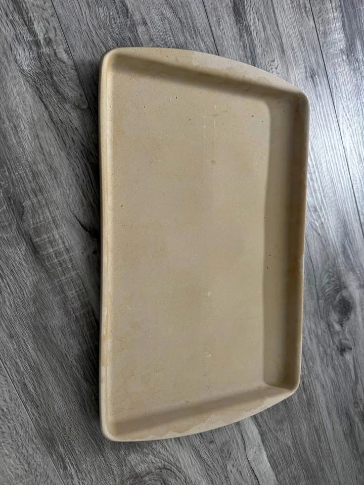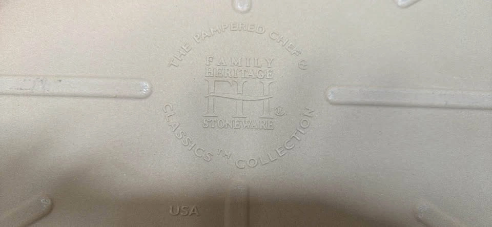 Used once, pampered chef baking sheet stoneware. 16” x 11” Last photo is a smaller one, for price comparison.
