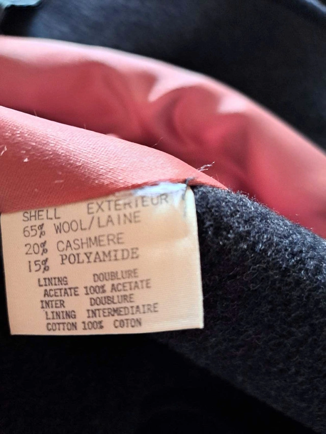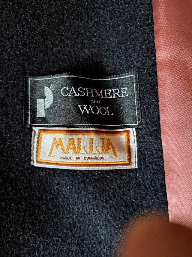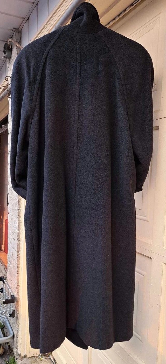 Step into classic vintage style with this womens Mallia charcoal wool cashmere overcoat, expertly crafted in Canada. Featuring a timeless double-breasted design with a refined men’s cut, this coat offers a chic, slightly oversized silhouette perfect for women who appreciate elegant, versatile outerwear. The soft lavender mauve satin lining adds a subtle, sophisticated pop of color inside, making it a unique and stylish find for vintage fashion lovers. Material: Wool and cashmere blend Color: Charcoal exterior with lavender mauve lining Style: Double-breasted peacoat, men’s classic fit tailored for women Era: 1980s–90s vintage Canadian craftsmanship Condition: Immaculate, like new Size: XL Length: 45.5 inches This coat blends warmth, elegance, and timeless design — perfect for adding a polished, vintage touch to your wardrobe.