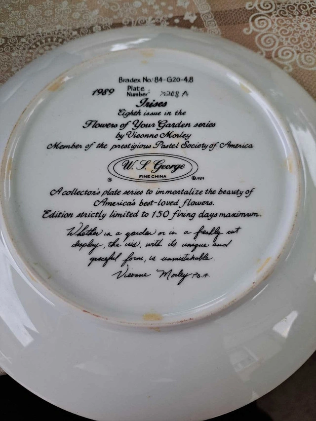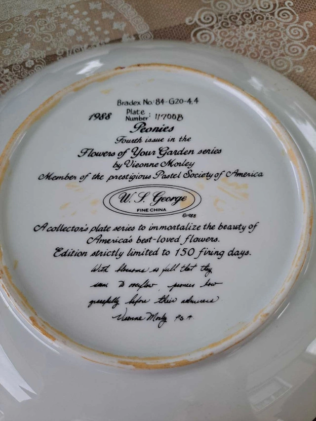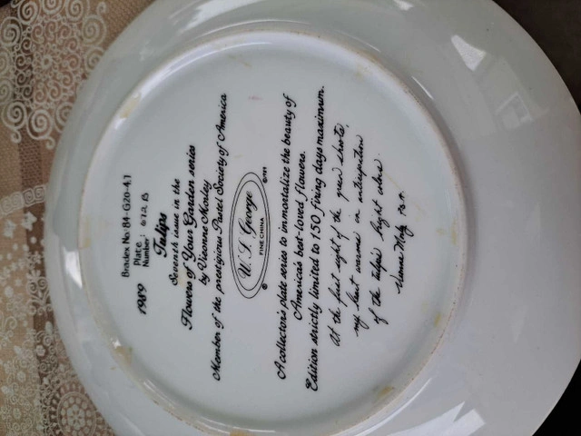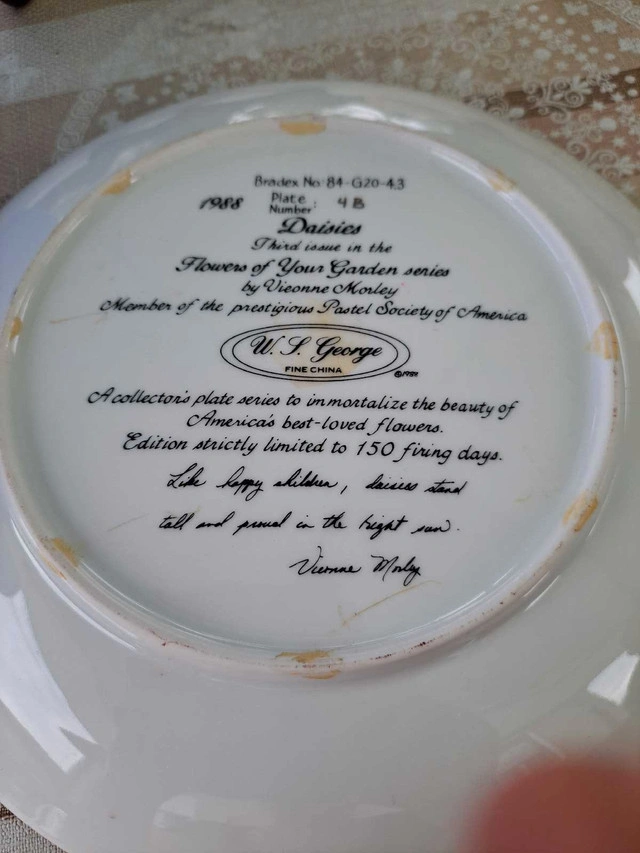 Selling a beautiful collection of W.J. George Fine China decorative plates. These are limited edition collector's items, known for their detailed artwork and high-quality porcelain craftsmanship. Details: Set of 4 plates Plate numbers: 11700B, 7208A, 627B, and 4B Fine porcelain with detailed backstamps Limited edition with artist and series markings Display-only (not for food use) Excellent vintage condition – no chips, cracks, or fading Great for collectors or home décor Bonus: These plates look amazing on display walls, in cabinets, or as part of a vintage art collection.