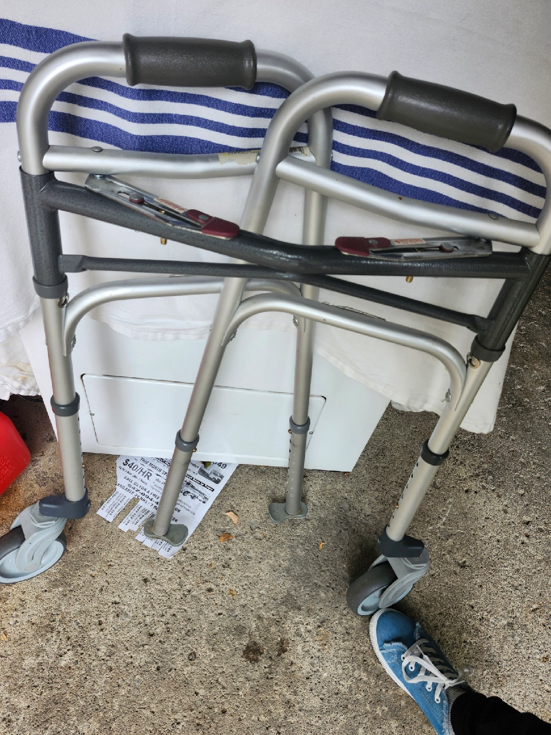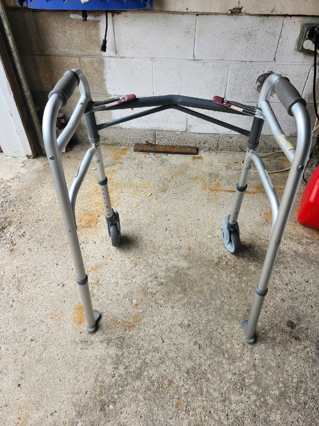 Selling a rolling walker in good condition. It has adjustable height settings and a comfortable grip. Great for anyone needing a little extra support!