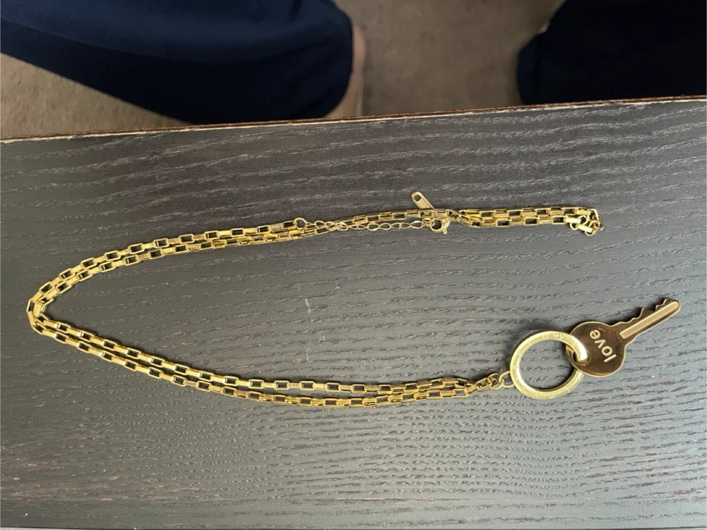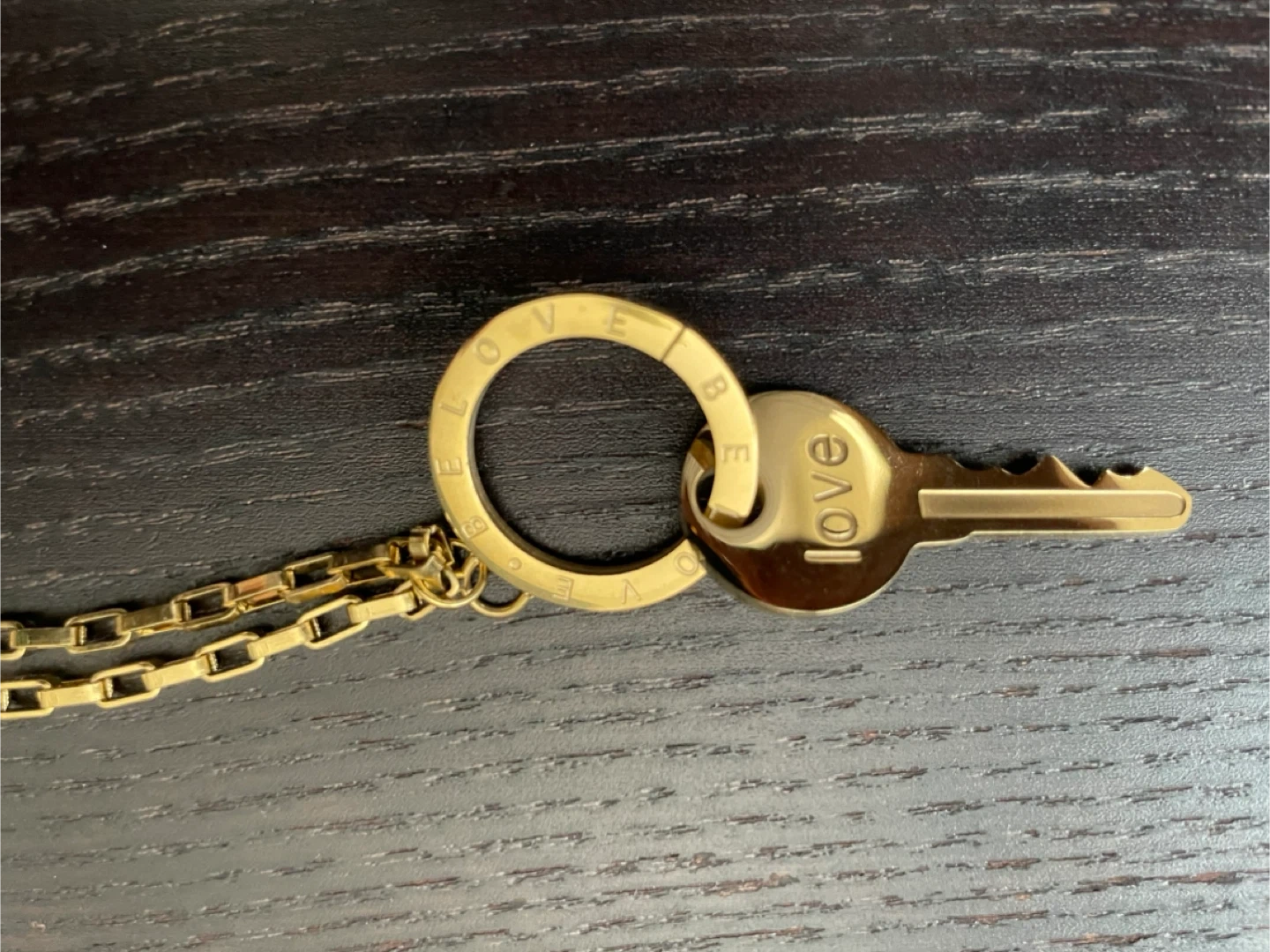 This is a beautiful beloved silver gold plated key necklace in new condition! The necklace features a delicate gold chain and a key pendant with the word "Belove " engraved on it. It's a stylish accessory that adds a touch of luxury to any outfit
