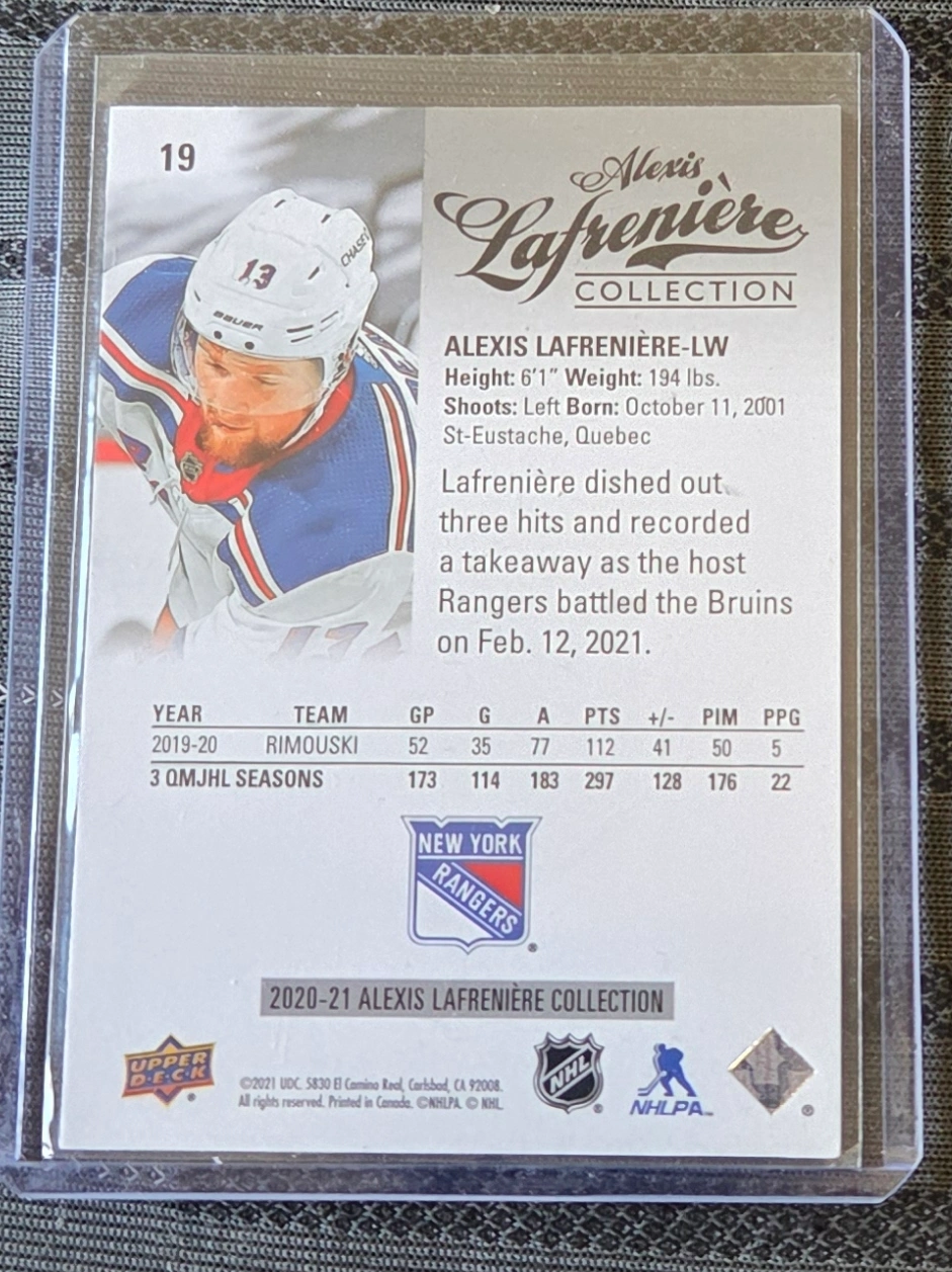 Selling an Alexis Lafrenière hockey card from the 2020-21 Alexis Lafrenière Collection. It features Alexis Lafrenière as a Left Wing for the New York Rangers. The card also includes some career stats from his time with Rimouski. A great addition to any hockey card collection!