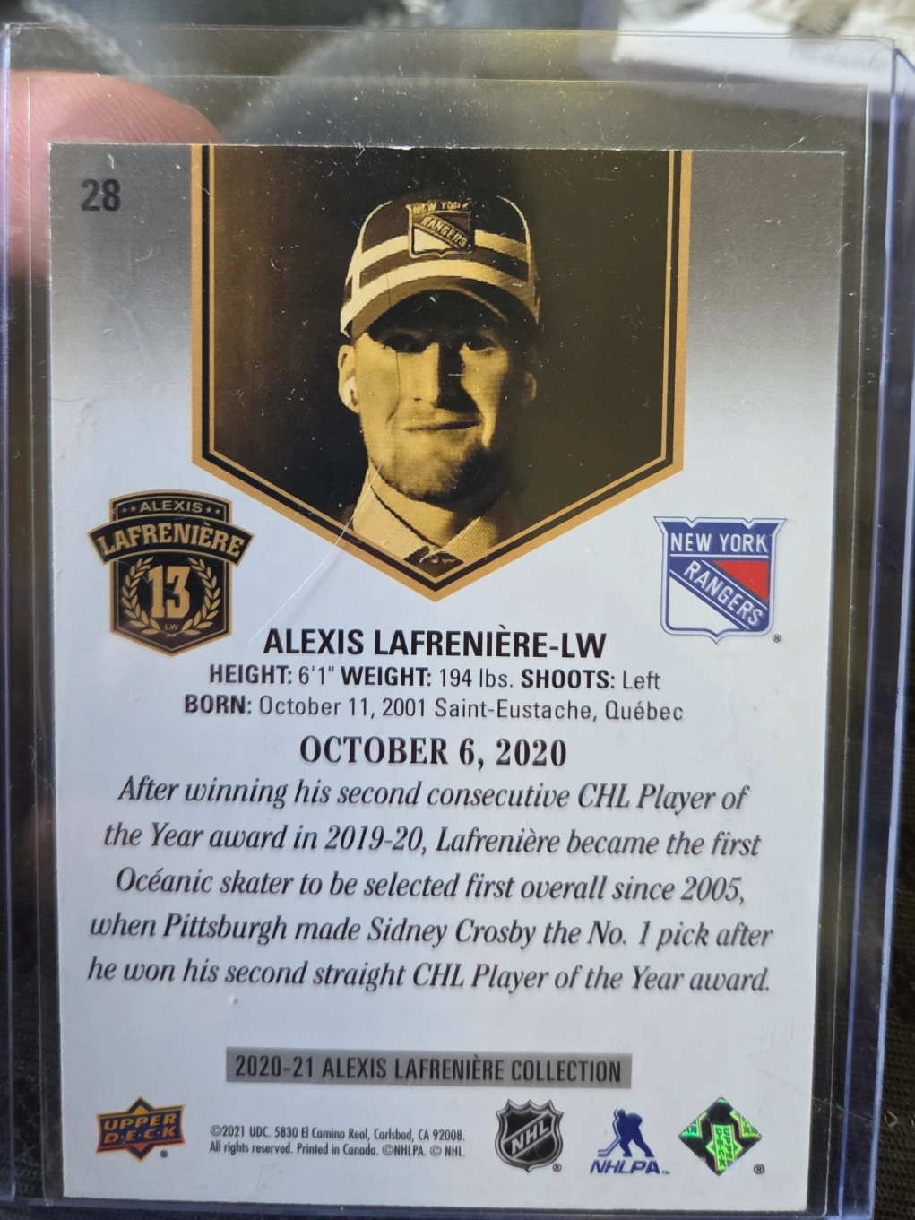 Selling an Alexis Lafrenière Upper Deck hockey card. This card commemorates Lafrenière becoming the first Rimouski player selected first in the NHL Draft since Crosby in 2005. He was born on October 11, 2001, in Saint-Eustache, Québec, and shoots left.