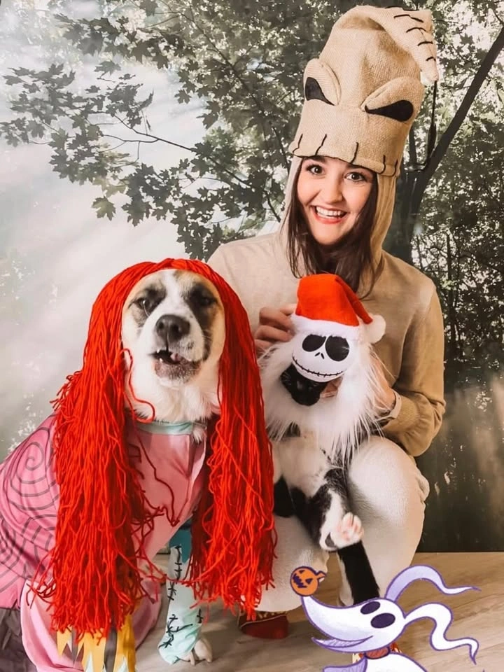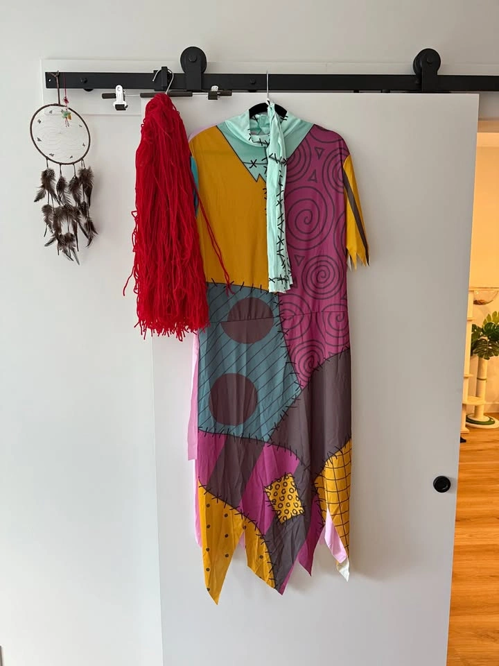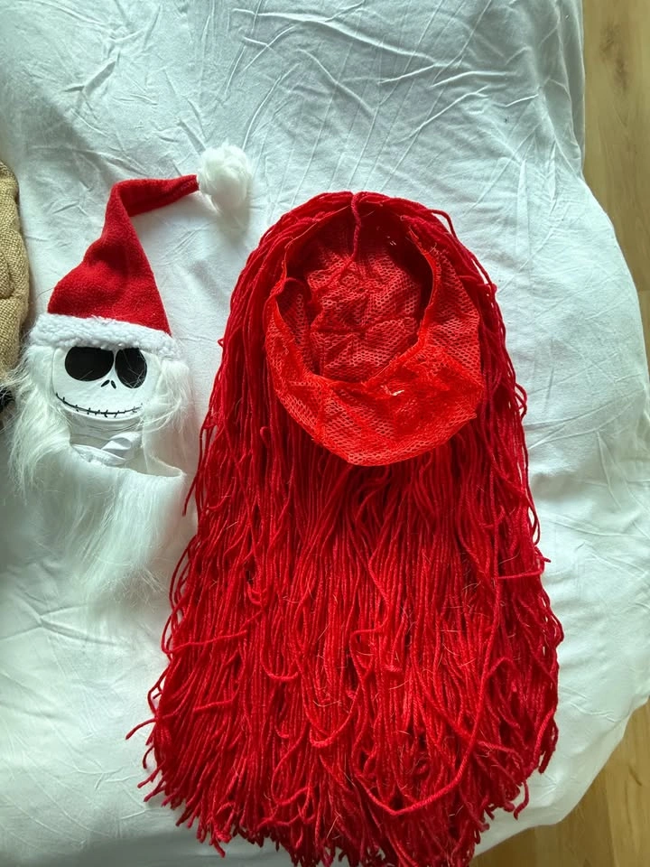 Costume Set for The Nightmare Before Christmas theme. Includes: 1. Sally Dress 2. Oogie Boogie Hat 3. Jack Skeleton Pet Hat Only worn briefly for a photo shoot. Sally Set (New $45): Size 12 dress (with adjustable waist ties) Comes with two arm sleeves 100% Polyester Red wig Note, the back of the dress is all pink Oogey Boogey Hat (New $38): Size: Standard (fits most) 100% polyester burlap and broadcloth Hat has hook and loop fastener size-adjustment band in lining and hidden pocket for cash or ID Jack Skelleton - Pet Hat (New $18) Fits a small dog or cat