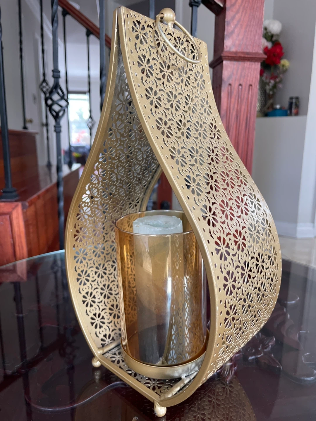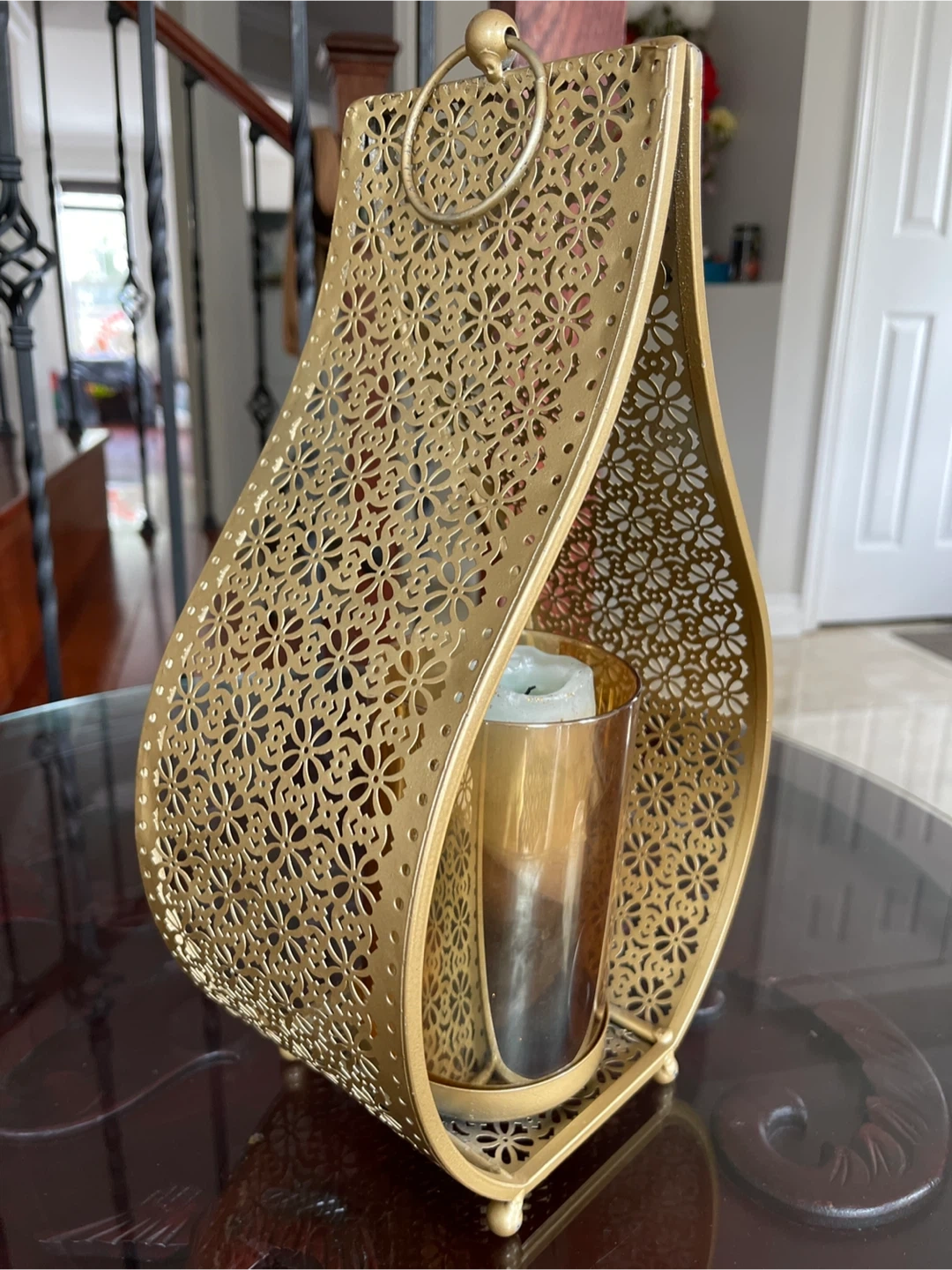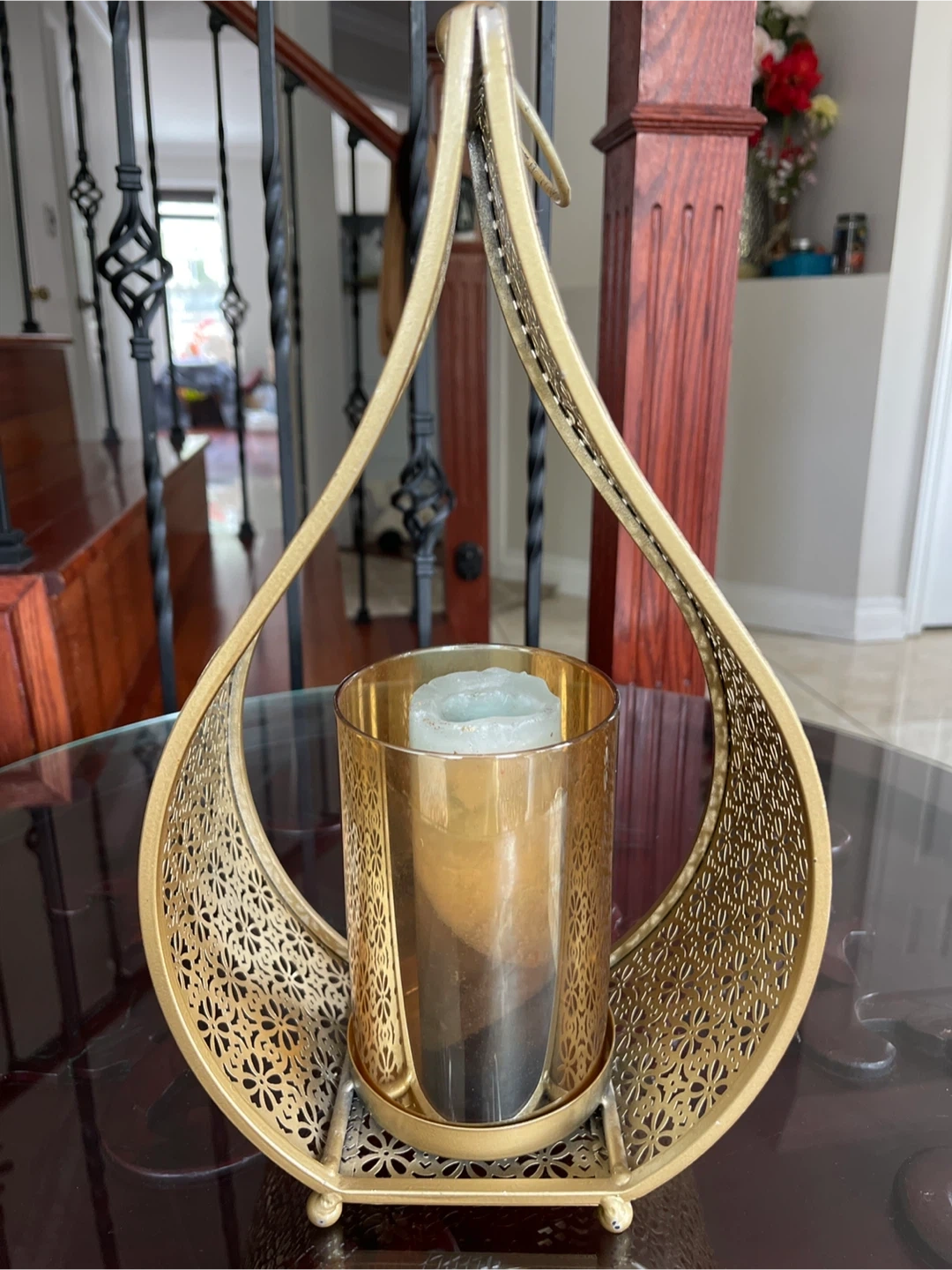 Selling a lovely gold-coloured metal candle holder! It comes with a glass insert for the candle. The metal has a nice decorative pattern. It's in great condition and would look lovely in any room