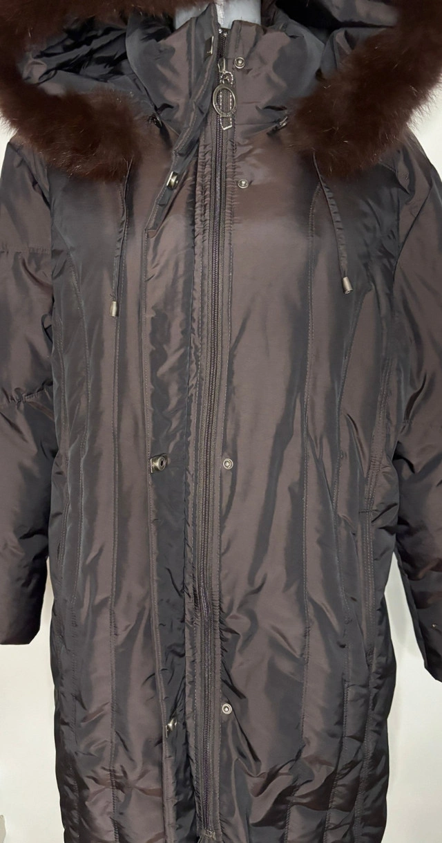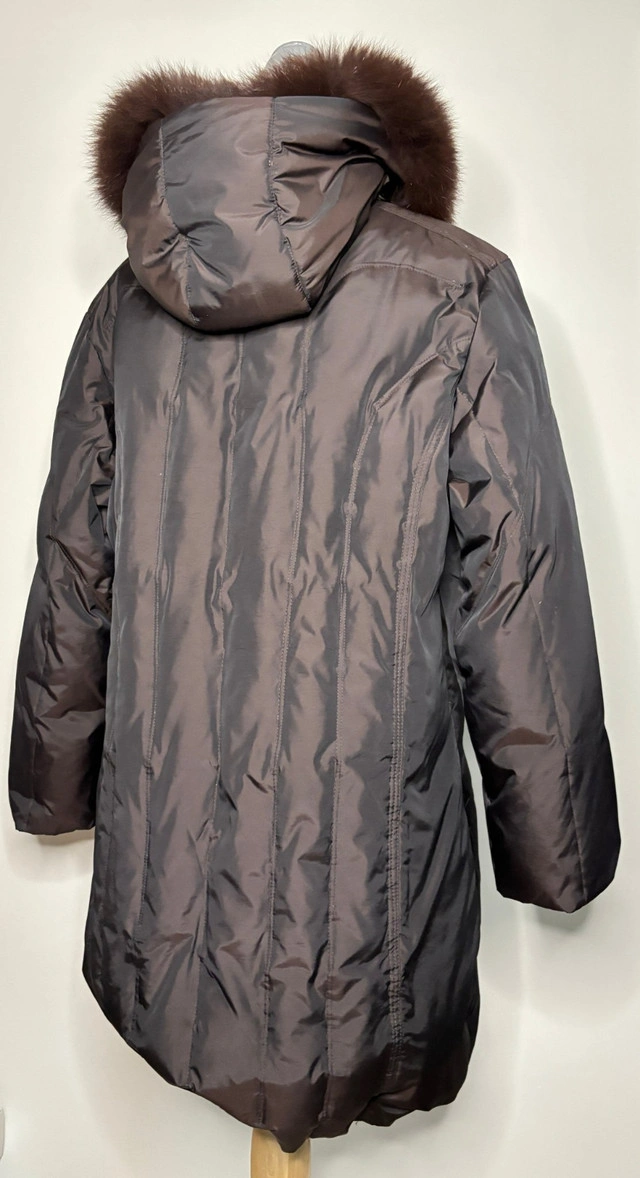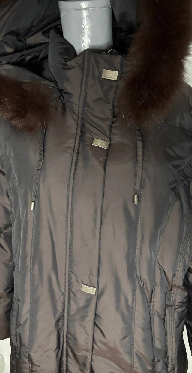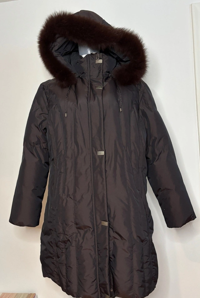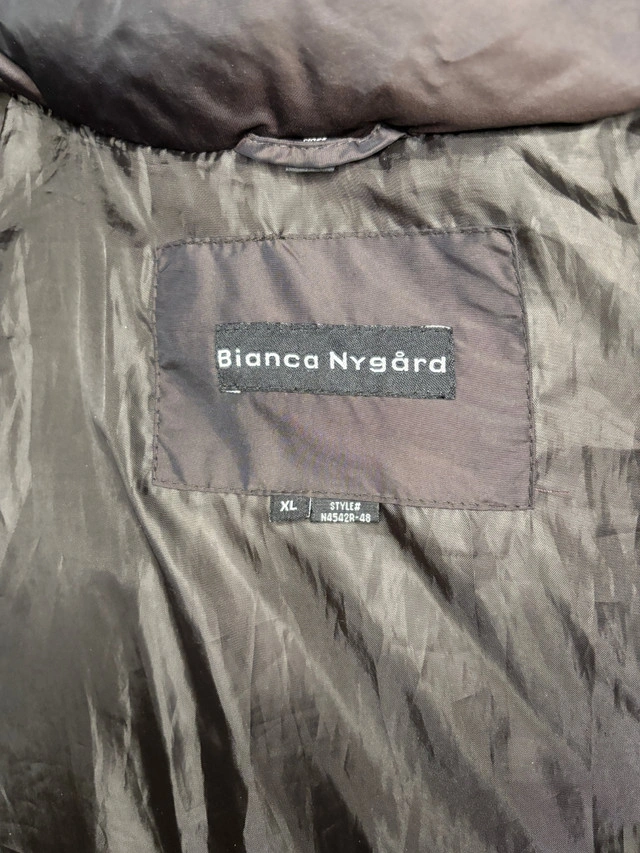 Keep yourself warm and stylish when the temperature drops with the Bianca Nygard Women's Hooded Winter Coat. Designed for comfort and elegance, this coat features a cozy hood, durable outer fabric, and a flattering shape. Perfect for chilly days, it offers excellent insulation for those chilly walks or forays out into the cold. This women's winter coat provides practical features such as deep pockets, a detachable hood, and a secure zipper and button combination closure for a great blend of function and fashion. This Bianca Nygard Women's Hooded Winter Coat Style N45428 is ideal for casual outings or dressing up during the colder months. The exterior material is 65% nylon and 35% polyester while the filling is 70% down and 30% feathers. It is a size extra large women's coat and for measurements, please see the attached photo in this listing. Local pickup is in Etobicoke near Islington and The Westway.