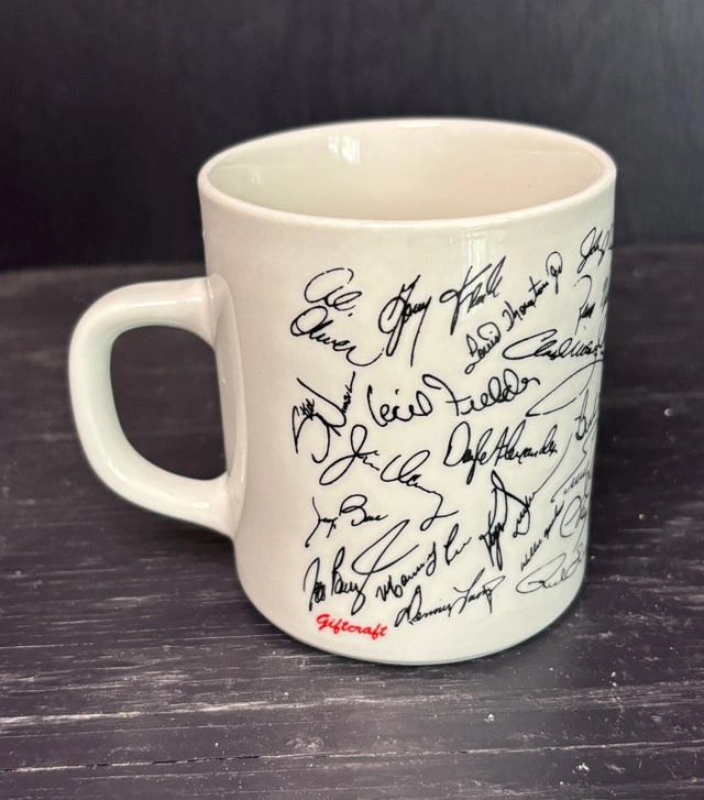 Celebrate Canadian baseball history with this Vintage Giftcraft Toronto Blue Jays 1985 Championship Mug. This authentic Blue Jays mug features the official Blue Jays logo and a 1985 Championship commemorative design that sees replicas signatures from all of the players on the team. The classic Jays logo is perfectly position on the center of this mug to easily show your love for the team. A great Toronto Blue Jays collectible for any Blue Jays fan, sports memorabilia collectors or 1980s nostalgia enthusiasts. Relive the glory days with this rare piece of Toronto sports history. Local pickup is in Etobicoke near Islington and The Westway.