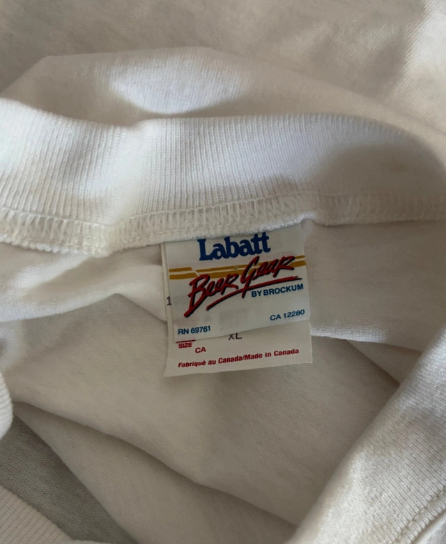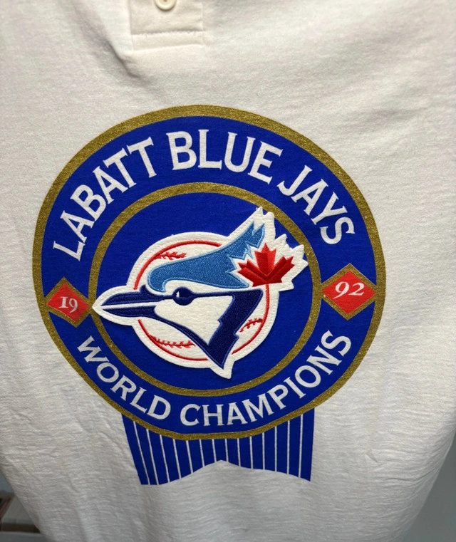 Celebrate baseball history with the Labatt Toronto Blue Jays 1992 World Series 3/4 Sleeve Shirt. Not only wear this while watching the game, show your love for your Toronto Blue Jays every day while you are at the office, running errands or lounging in your home. This limited print Toronto Blue Jays shirt was issued to Labatt's Brewing employees after their first 1992 World Series victory. It features a retro Blue Jays logo and denotation of their victory. This 3/4 sleeve length tee sees their front logo in twill/embroidery on a scree printed background. Made from 100% cotton, the soft, breathable fabric is comfortable and breathable. Perfect for Toronto Blue Jays fans or vintage sportswear and clothing, wear this awesome Jays shirt and relive the glory. This is an adult XL shirt that is in excellent condition with no rips, tears or stains. For measurements, please see the attached picture included with this listing. Local pickup is in Etobicoke near Islington and The Westway.