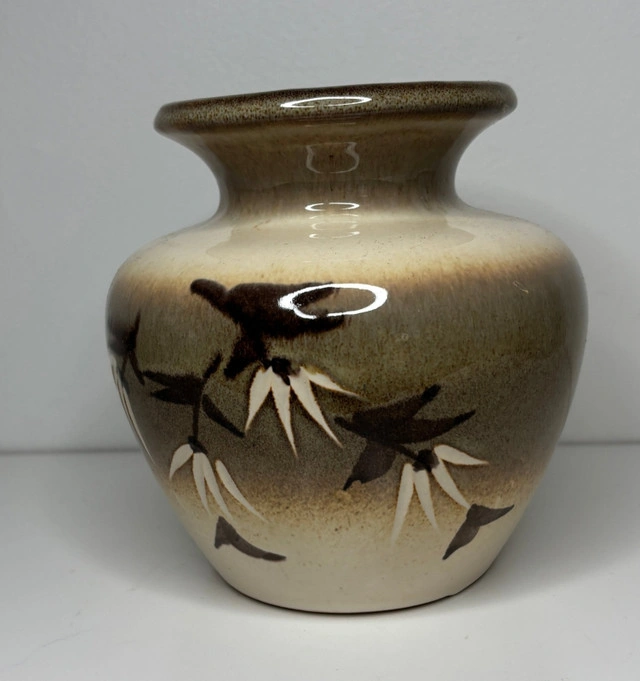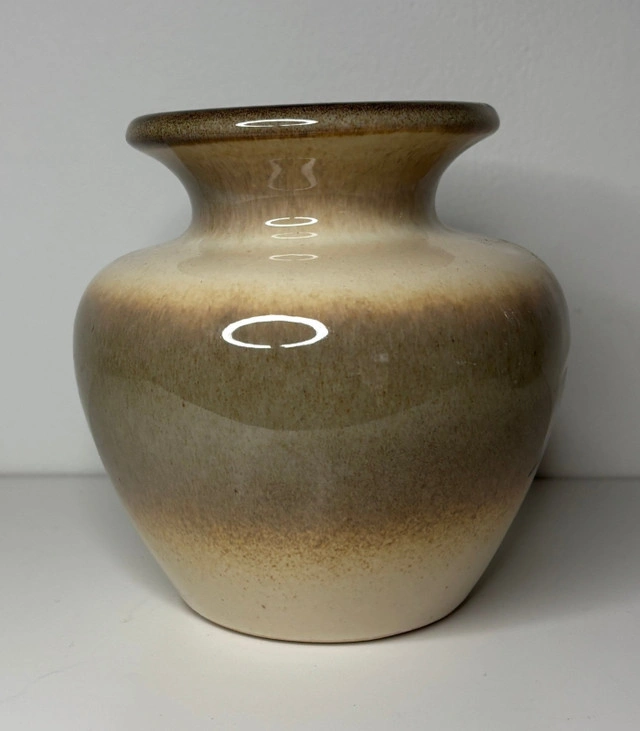 The wonderful pottery stylings of Scheurich of West German stand out in this beautiful Pottery Vase. Imagine it sitting in your foyer or entertaining area filled with a beautiful floral arrangement that brings color and life to your space. The rich colors and unique flower based motif allows to you place this in a noticeable place in your home that will surely garner attention. The brown and cream colored floral and leaf motif on a beige background provides a touch of elegance and worldliness that will make a fantastic addition to your home décor. The wide body and flared rim provide ample room to display any small to mid sized flower arrangement. Add this Scheurich West Vase to your home collection and add life and vibrancy to your home. This Scheurich West German Pottery Vase measures approximately 5 inches tall. Local pickup is in Etobicoke near Islington and The Westway.