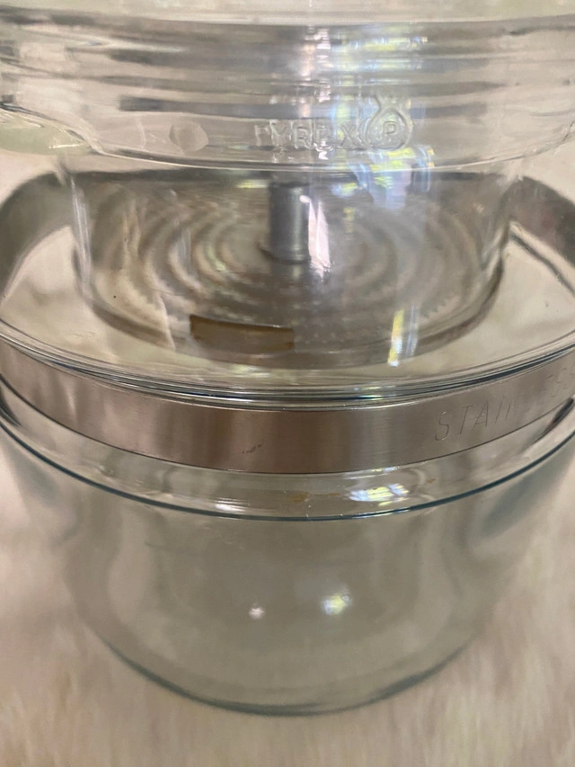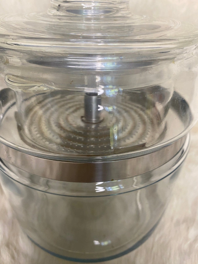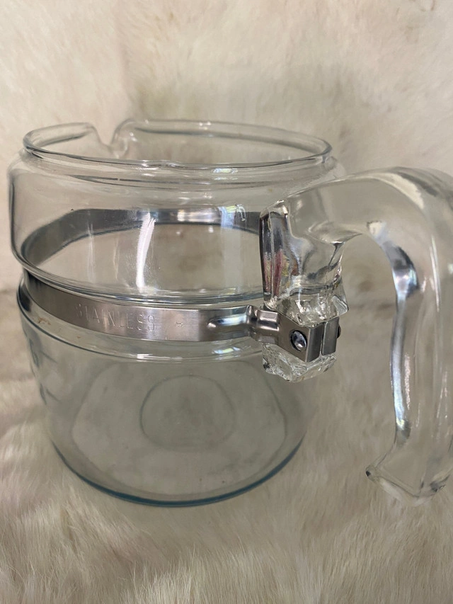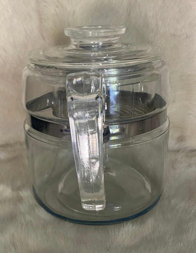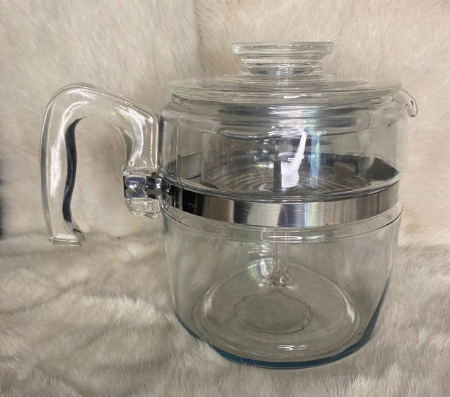 Rediscover the art of making coffee from scratch with a Vintage Pyrex Flameware 7756 Coffee Pot, a true functional piece of coffee and housewares history. Bringing the authentic charm and rich flavor of percolated coffee to your modern kitchen, this wonderful Pyrex coffee percolator has been an iconic staple in kitchens around the world. Watching the coffee brew through its iconic flame-resistant glass is an experience coffee connoisseurs can connect to as they savor the sights and smell of their favorite coffee blend. Made from Pyrex glass Flameware, it can go directly on a gas, electric, or ceramic stovetop to percolate coffee the traditional way. The result is a robust, full bodied cup of coffee that you will surely prefer. With a sturdy handle and elegant spout, is a beautiful display piece that can function when you are ready to start the day or entertaining family and guests. Bring timeless Style and flavor to your kitchen and taste the difference tradition makes with this classic Pyrex glass coffee pot. This Vintage Pyrex Flameware 7756 6 Cup Glass Coffee pot is pre owned but in excellent condition and in intact with all parts showing no cracks or chips. Local pickup is in Etobicoke near Islington and The Westway.