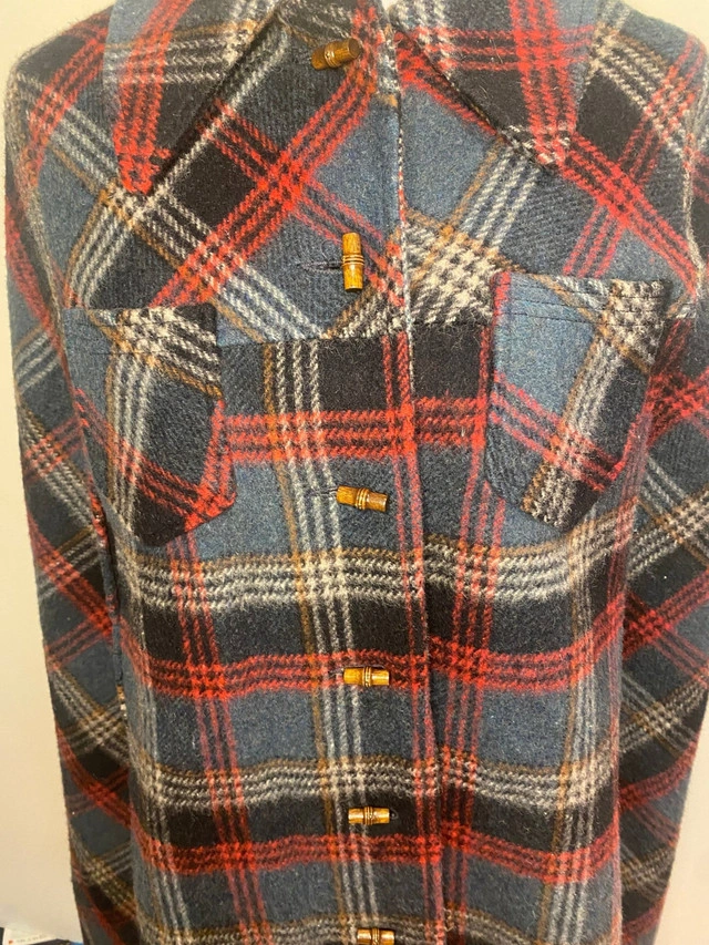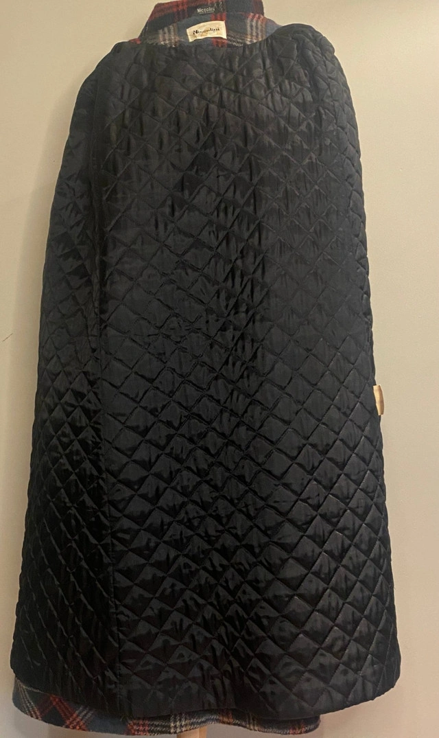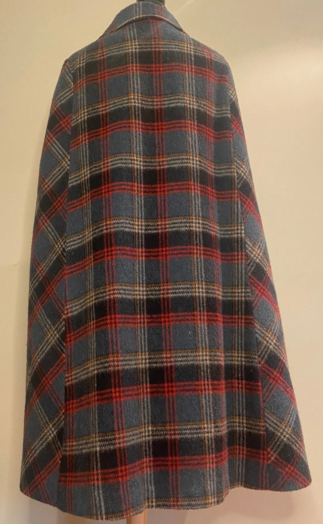 Show off your unmatched elegance with the Made in Canada Niccolini Vintage Women’s Wool Cape Coat. Crafted from high-quality wool, this beautifully tailored cape coat features a plaid design and flattering silhouette. The made in Canada label ensures exquisite craftsmanship and luxurious warmth. Add this Niccollini cape coat to your wardrobe and winter wear to add sophistication to any style of clothing. A rare find for vintage fashion lovers and collectors. Pair this wonderful coat with jeans, a casual pair of pants, skirt or dress and wear if for any occasion to make a bold, fashion conscious statement. For measurements of this Niccolini Women’s Wool Cape Coat, please see the picture included in our listing. Although pre-owned, this Wool Coat is in excellent condition with no rips, stains or smell. Please note that although sleeveless, there are arm slots for you to couple this with a warm sweater, blazer or jacket. Local pickup is in Etobicoke near Islington and The Westway.